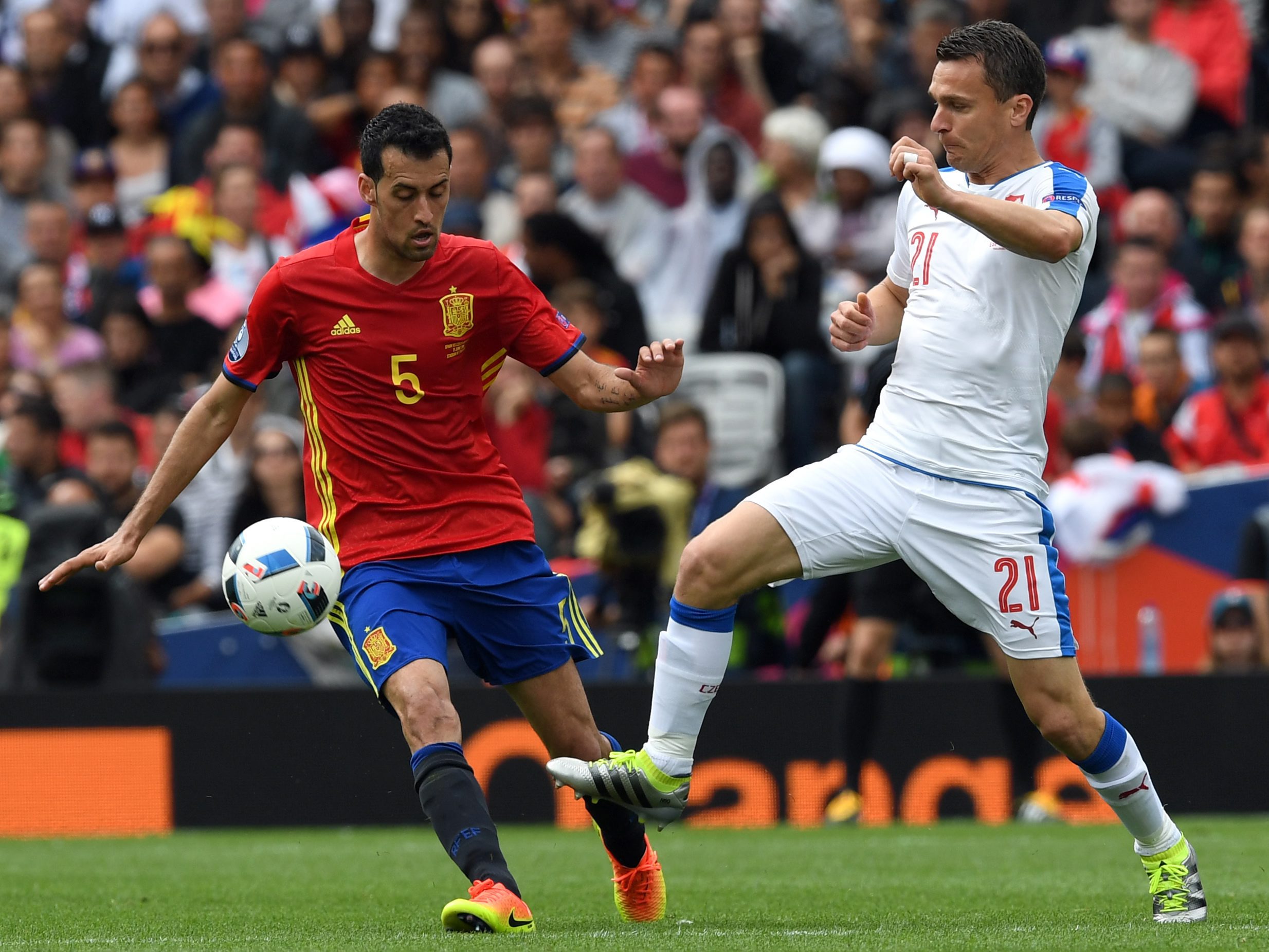Sergio Busquets luchando por la pelota junto a David Lafata de la República Checa.
