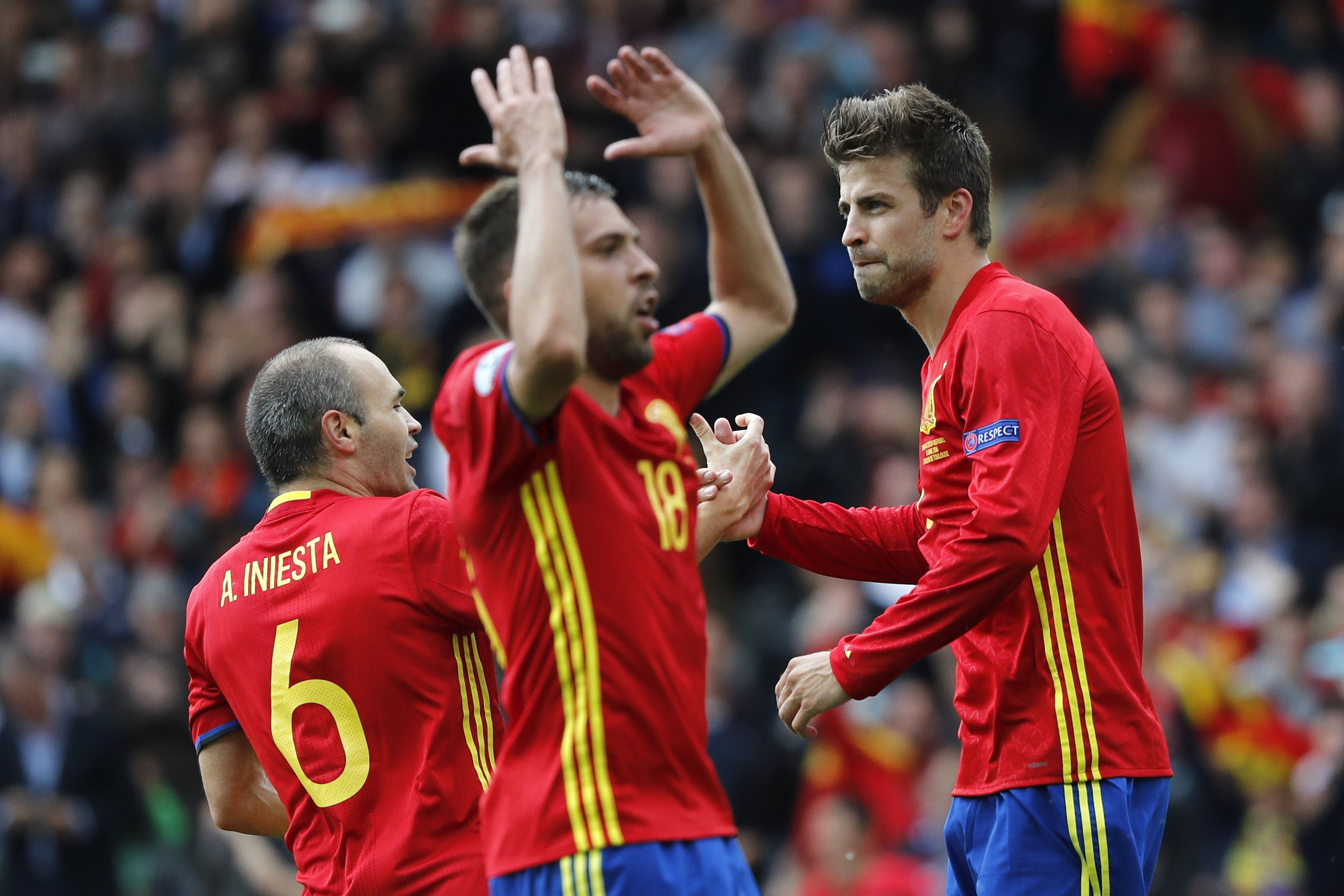 El defensa de España Gerard Piqué recibe la felicitación de su compañero Andrés Iniesta en partido ante la República Checa del Grupo D de la Eurocopa de Fútbol de Francia 2016.