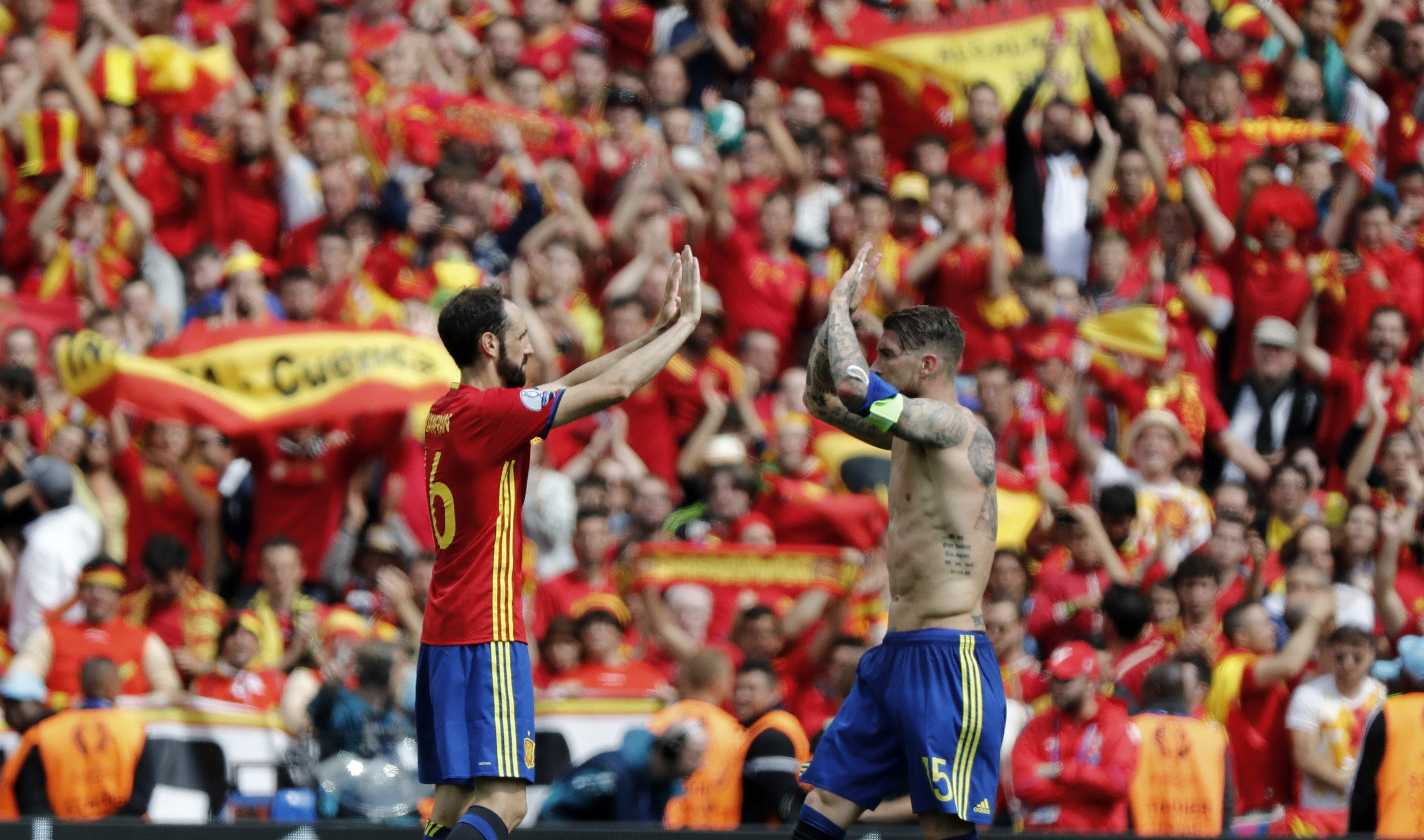 Juanfran y Sergio Ramos, sin camiseta, celebran la victoria de España ante la República Checa, en el primer partido de la fase de grupos de la Eurocopa de Francia 2016.