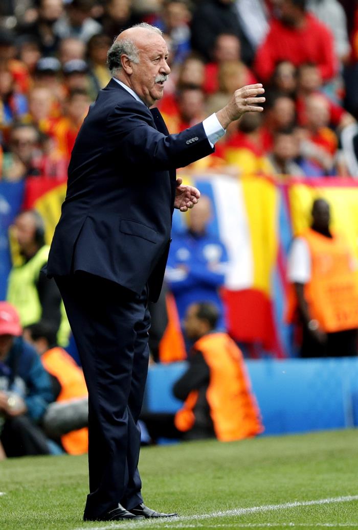 Vicente del Bosque, seleccionador nacional de fútbol, dando indicaciones a los jugadores.