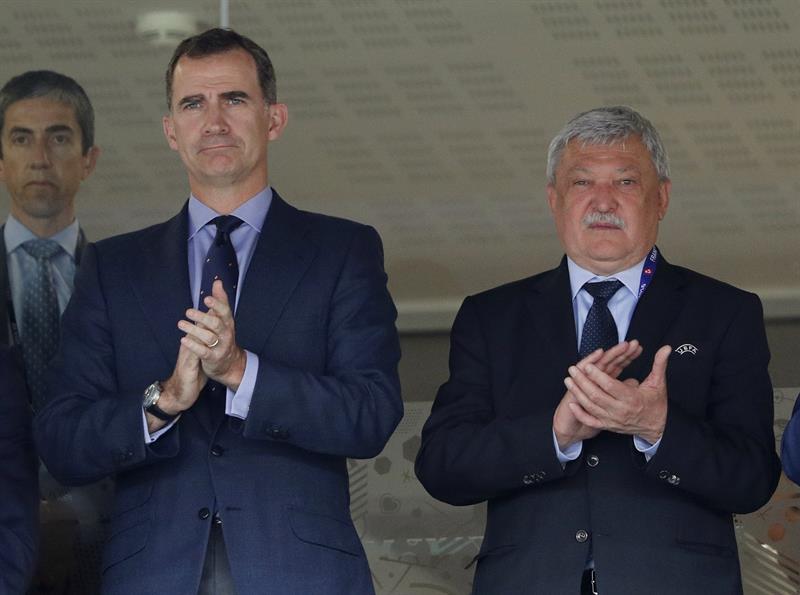 El rey Felipe VI junto a Sándor Csányi (d), de Hungría, miembro del Comité Ejecutivo de la UEFA, asiste al partido España-República Checa.