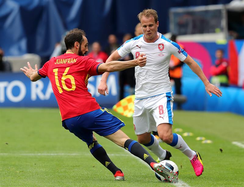 David Limbersky de la República Chea junto a Juanfra, en un momento del partido.