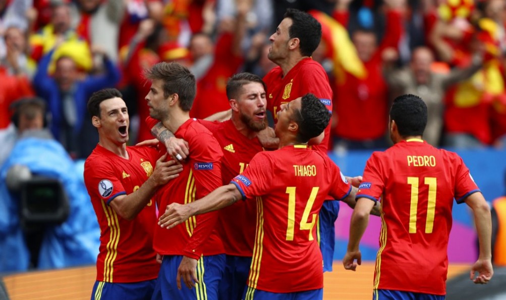 España juega con David de Gea, en la portería; Juanfran Torres, Gerard Piqué, Sergio Ramos y Jordi Alba, en la defensa; Cesc Fábregas, Sergio Busquets y Andrés Iniesta, en el medio campo; y David Silva, Álvaro Morata y Nolito, en ataque.