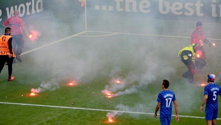 A diferencia de los rusos, los ultras croatas no protagonizaron en Saint-Etienne enfrentamientos con la afición rival, aunque lanzaron bengalas al campo, lo que obligó al árbitro a suspender el partido durante unos minutos.