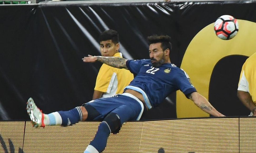 Argentina ganaba 0-3 en la semifinal de la Copa América Centenario ante Estados Unidos. En un lance del juego, Lavezzi quiere controlar un balón, se resbala, y se tropieza con la valla de publicidad. La tremenda caída de espaldas dejó al delantero argentino postrado en el suelo.