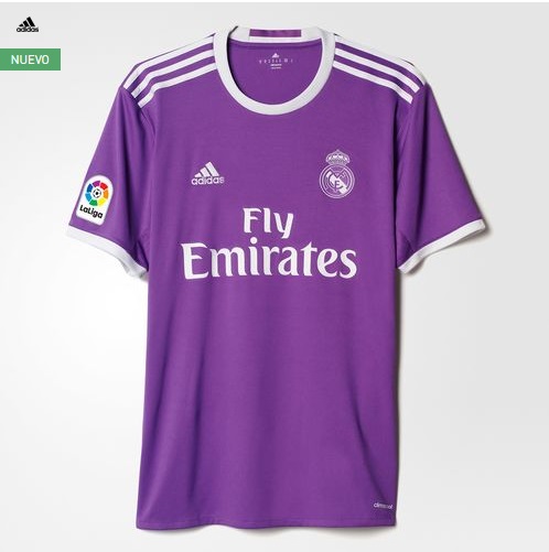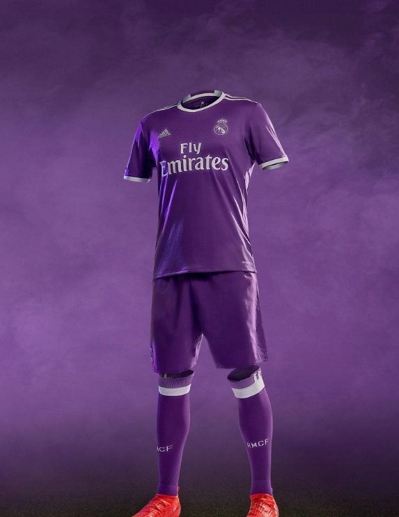 Como ya ha pasado en otros años, el Real Madrid ha escogido el morado para su segunda equipación. El azul, color secundario de la primera camiseta, se cambia por el blanco.