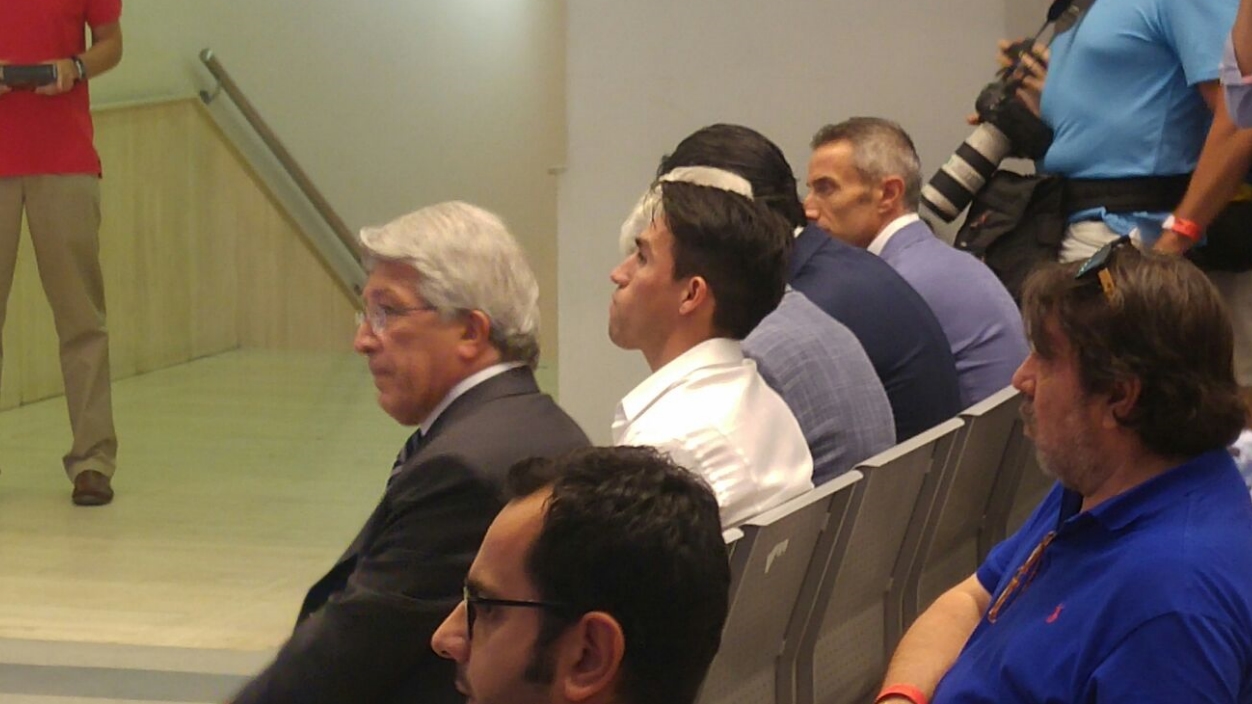 Nico Gaitán (c), sentado junto a Enrique Cerezo, presidente del Atlético; Clemente Villaverde, gerente del club; José Luis Pérez Caminero, director deportivo; y Andrea Berta, director técnico.
