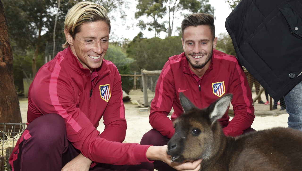 Los jugadores Fernando Torres y Saúl Ñíguez también fueron protagonistas en una visita al zoo de Melbourne, en la que se fotografiaron con algunos de los animales más representativos de la fauna australiana, como canguros o koalas.