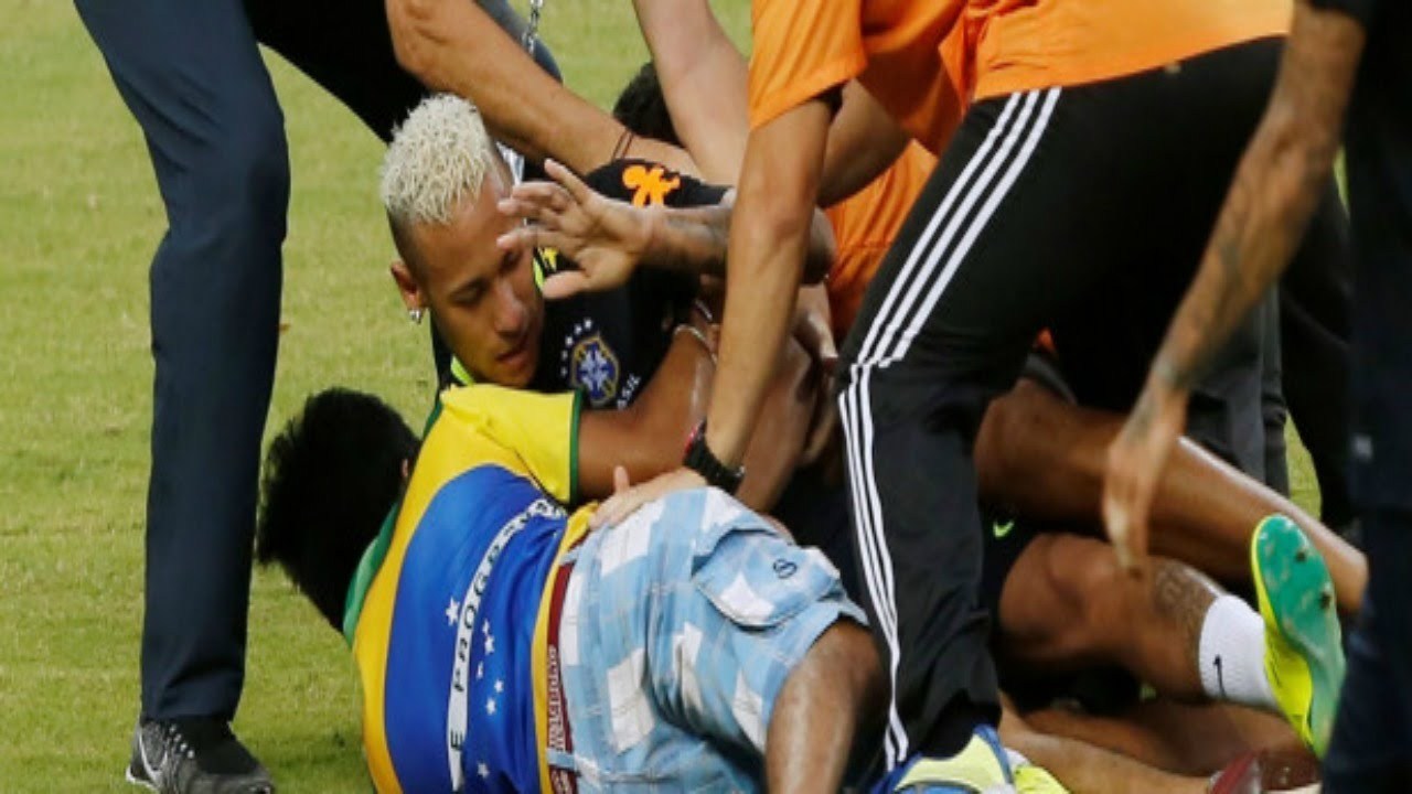 Poco antes de que concluyera la sesión de entrenamiento, decenas de personas consiguieron burlar la seguridad del estadio Arena da Amazonia y uno de ellos llegó incluso a derribar a Neymar en su afán por acercarse al astro de la canarinha.