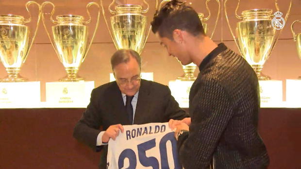 El delantero portugués del Real Madrid ha celebrado junto al presidente del club, Florentino Pérez, la cifra de 350 partidos como jugador blanco.