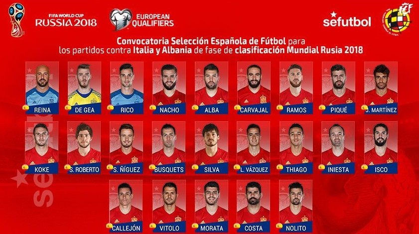 DELANTEROS: Álvaro Morata (Real Madrid), Lucas Vázquez (Real Madrid), Nolito (Manchester City), Diego Costa (Chelsea), Vitolo (Sevilla) y José Callejón (Nápoles).