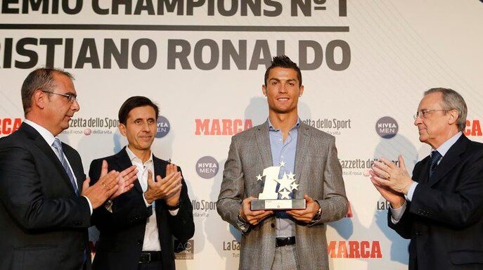 Cristiano Ronaldo ha recibido este jueves el premio al mejor jugador de la Champions League que otorgan los diarios Marca y La Gazzetta dello Sport. El galardón le ha sido entregado al crack portugués, en un acto celebrado en el Hotel AC La Finca de Pozuelo, gracias a su actuación en la pasada edición de la competición, la cual ganó con el Real Madrid.
