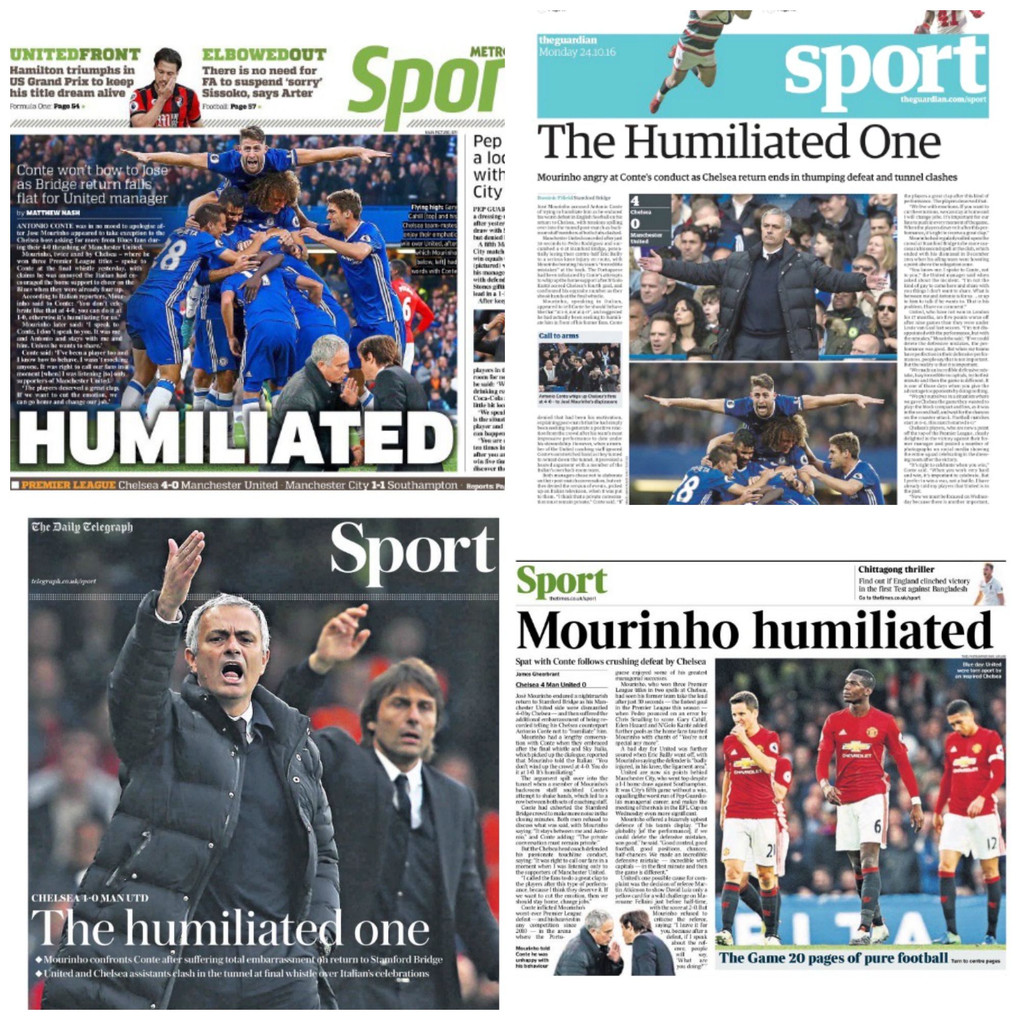"Mourinho humiliated", o lo que es lo mismo, "Mourinho humillado". Es un juego de palabras porque no sólo hacen referencia al abultado resultado en contra del Manchester United de Mourinho. También hacen referencia a la reprimenda del técnico portugués a Antonio Conte al termino del partido. Mou no se esperó al túnel de vestuario. Prefirió hacerlo en mitad del terreno de juego, mientras se saludaban, delante de todas las cámaras y los ojos del público.