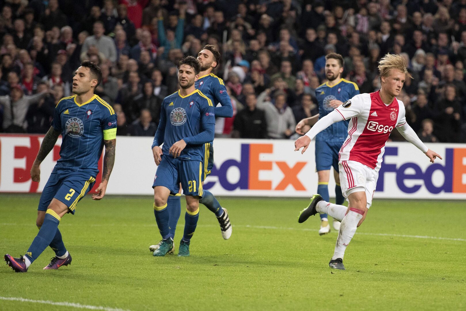 El Celta sufrió su primera derrota en la Liga Europa en su visita al campo del Ajax (3-2), liderado por un espectacular Kasper Dolberg que protagonizó una exhibición futbolística para dejarle a un punto de certificar matemáticamente su pase a la siguiente fase como primero de grupo, a pesar del esfuerzo final de los celestes, que fue insuficiente.