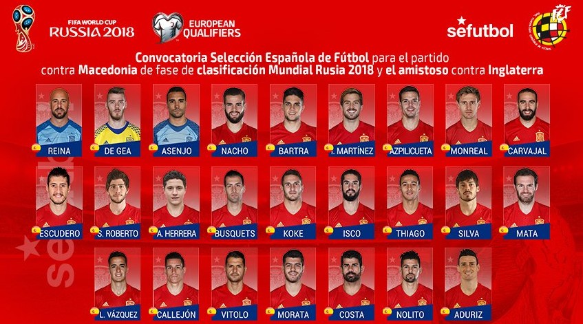 Además, también figuran las novedades de César Azpilicueta, Marc Bartra o Sergio Asenjo, dentro de una lista de 25 jugadores marcada por las importantes ausencias de los lesionados Sergio Ramos, Andrés Iniesta, Gerard Piqué o Jordi Alba.