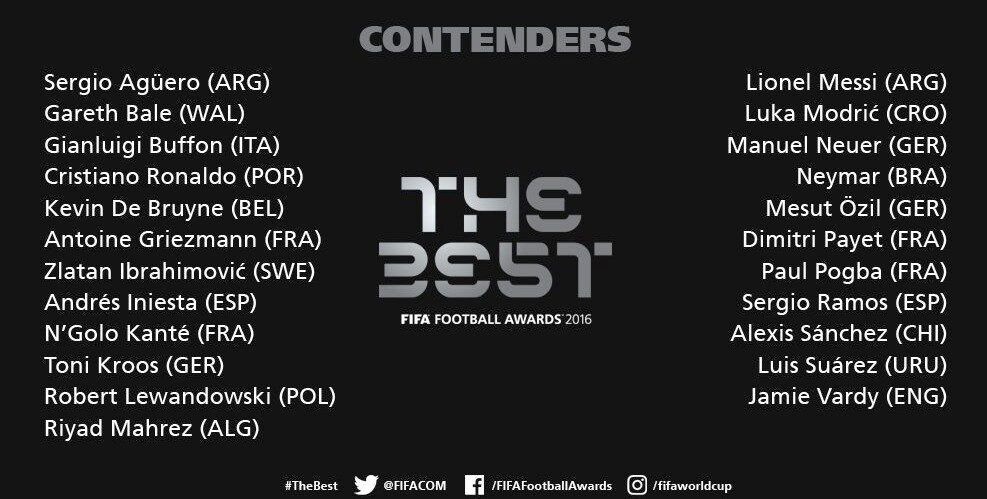 La lista completa está formada por Sergio Agüero, Gareth Bale, Gianluigi Buffon, Kevin De Bruyne, Antoine Griezmann, Zlatan Ibrahimovic, Andrés Iniesta, N'Golo Kante, Toni Kroos, Robert Lewandowski, Riyad Mahrez, Lionel Messi, Luka Modric, Manuel Neuer, Neymar, Mesut Özil, Dimitri Payet, Paul Pogba, Sergio Ramos, Cristiano Ronaldo, Alexis Sánchez, Luis Suárez y Jamie Vardy.