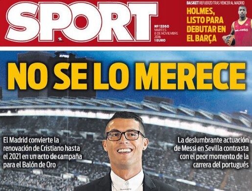 MD no se corta a la hora de pedir premios para Messi, pero Sport traspasa definitivamente la línea de la falta de respeto cuando utiliza en su portada la imagen de Cristiano Ronaldo en su acto de renovación bajo el siguiente titular: "No se lo merece". Lejos de quedarse ahí, el diario Sport mantiene su línea editorial hablando de "campaña" en el Bernabéu para dar repercusión a su estrella y que esta gane el Balón de Oro.