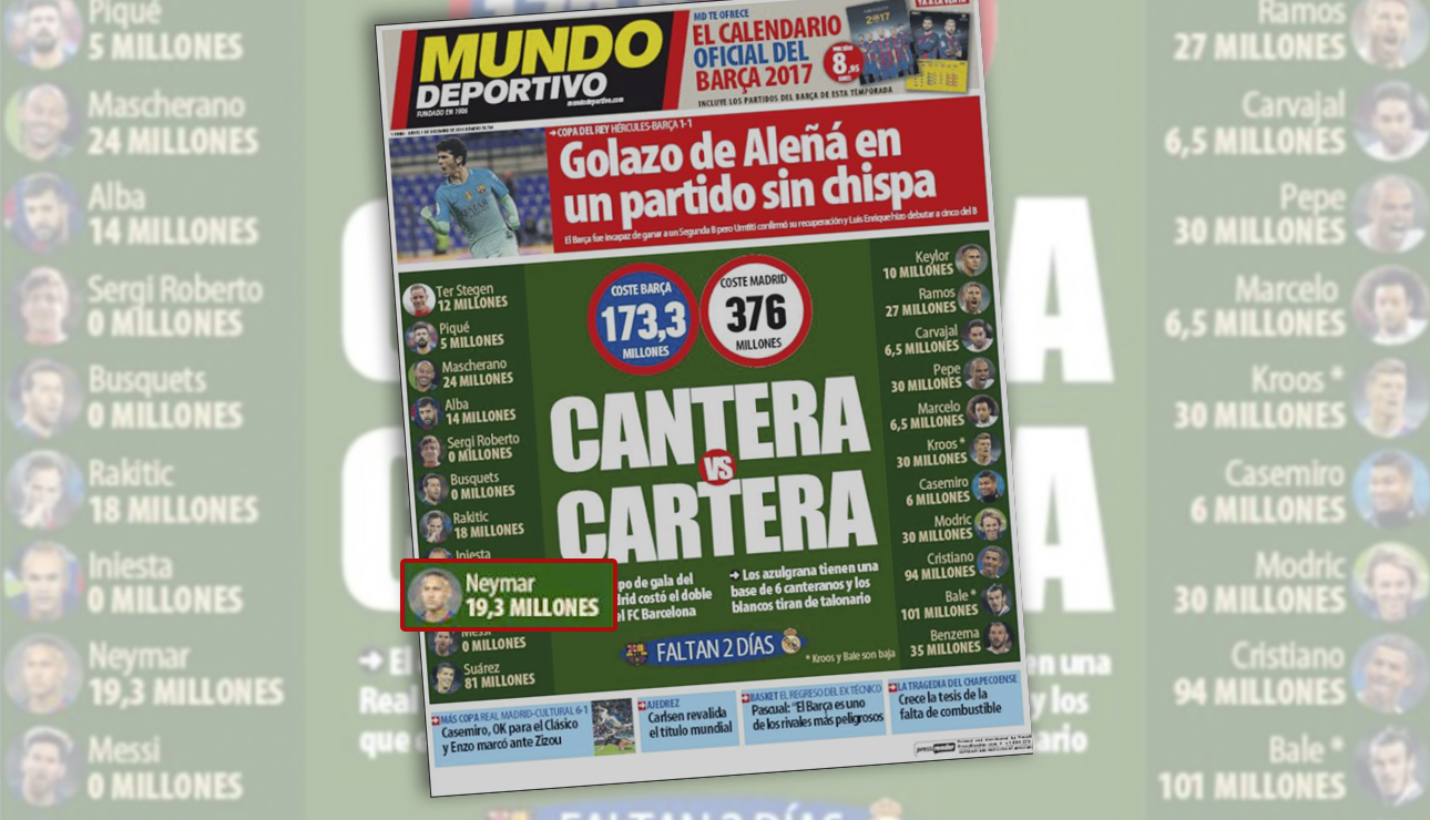 Ni el guionista que convenció a Sandro Rosell para gritar aquello de "Neymar costó 54 millones y punto" podría imaginarse que un medio de comunicación publicaría en su portada que el precio del jugador fue de 19,3 millones.