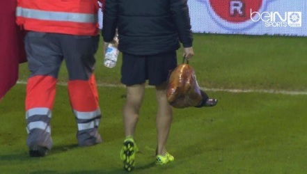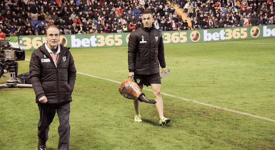 En el partido de ida de los 1/16 de final de la Copa del Rey que disputaban en el estadio Helmántico de la capital charra, el Guijuelo y el Atlético de Madrid, el conjunto chacinero no perdió la oportunidad de dar publicidad a su producto estrella ante las miradas de toda España. Además de utilizar su original equipación con un estampado de lonchas de jamón, el cuerpo médico dejó a todos boquiabiertos al saltar al césped con un botiquín... ¡en forma de jamón!