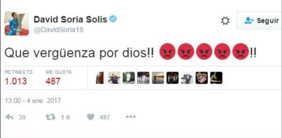 Otro Soria, en este caso el portero sevillista David, formado en la cantera del Real Madrid, que se quedó fuera de la convocatoria hispalense para el partido del Bernabéu y siguió desde su domicilio el choque, explotó en Twitter tras el penalti pitado por Mateu sobre Luca Modric: