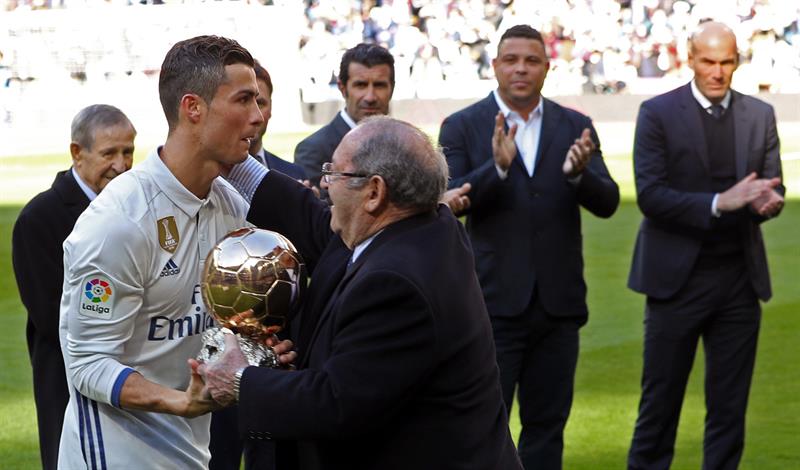 El delantero portugués Cristiano Ronaldo recibió este sábado su cuarto Balón de Oro de manos de Francisco Gento y dedicó el galardón a la afición del Real Madrid rodeado de varias de las leyendas del club blanco como Raymond Kopa, Michael Owen, Luis Figo, Ronaldo Nazario y Zinedine Zidane, que también poseen el trofeo.