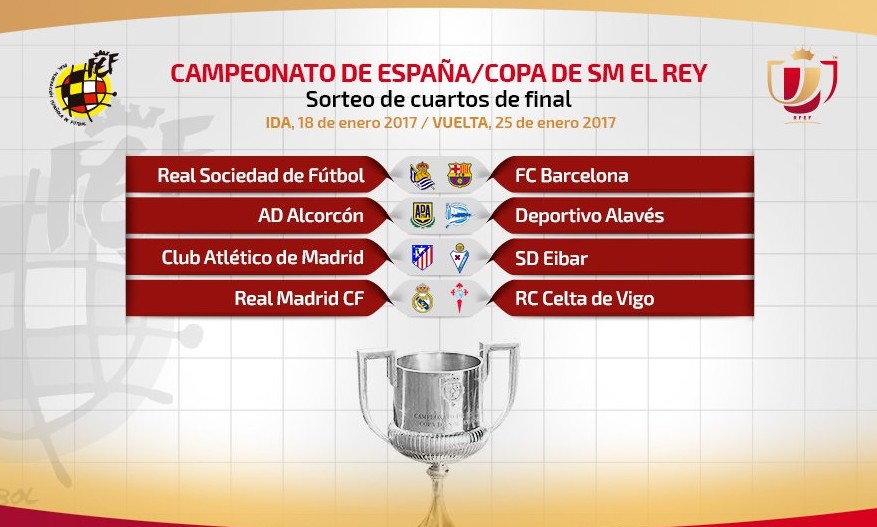 Eso sí, la suerte no ha terminado de sonreír ni a Barcelona ni al Real Madrid, que tendrán rivales exigentes en la Real Sociedad —uno de los equipos de moda en el fútbol español y que más se le atraganta a los azulgranas en los últimos tiempos— y el Celta de Vigo, respectivamente, mientras que el Atlético de Madrid se las verá con el Eibar. El último duelo enfrentará al Deportivo Alavés con el Alcorcón, el único superviviente de Segunda División en la ronda de los ocho mejores.