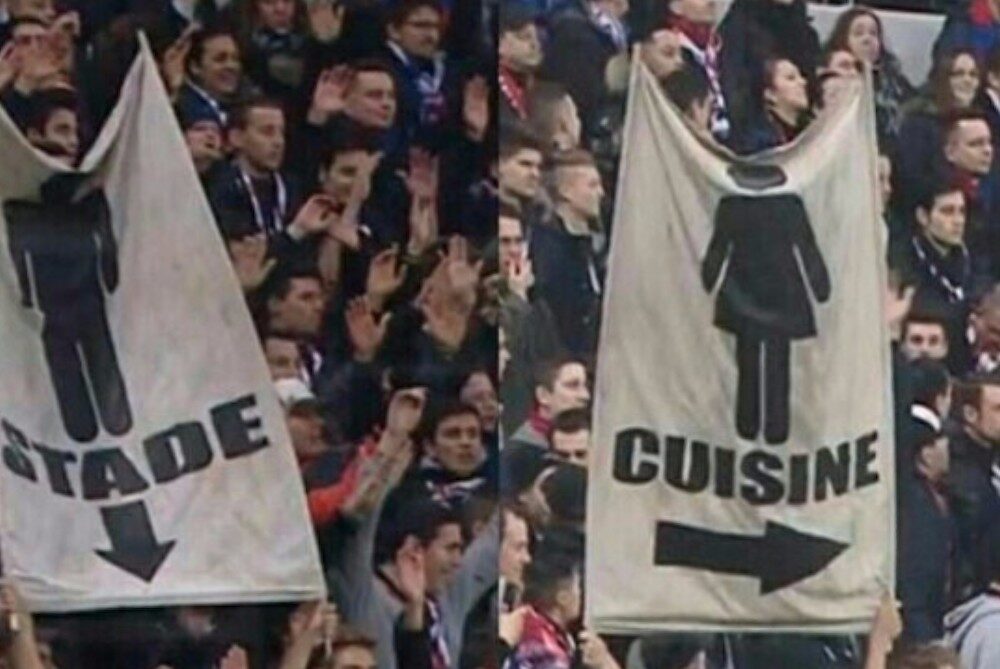 En las gradas, dos pancartas fueron protagonistas. Un pictograma de mujer con el mensaje "cocina" y otra con el de un hombre acompañado por el texto "estadio", ha provocado una tremenda polémica en Francia y ha incendiado las redes sociales.