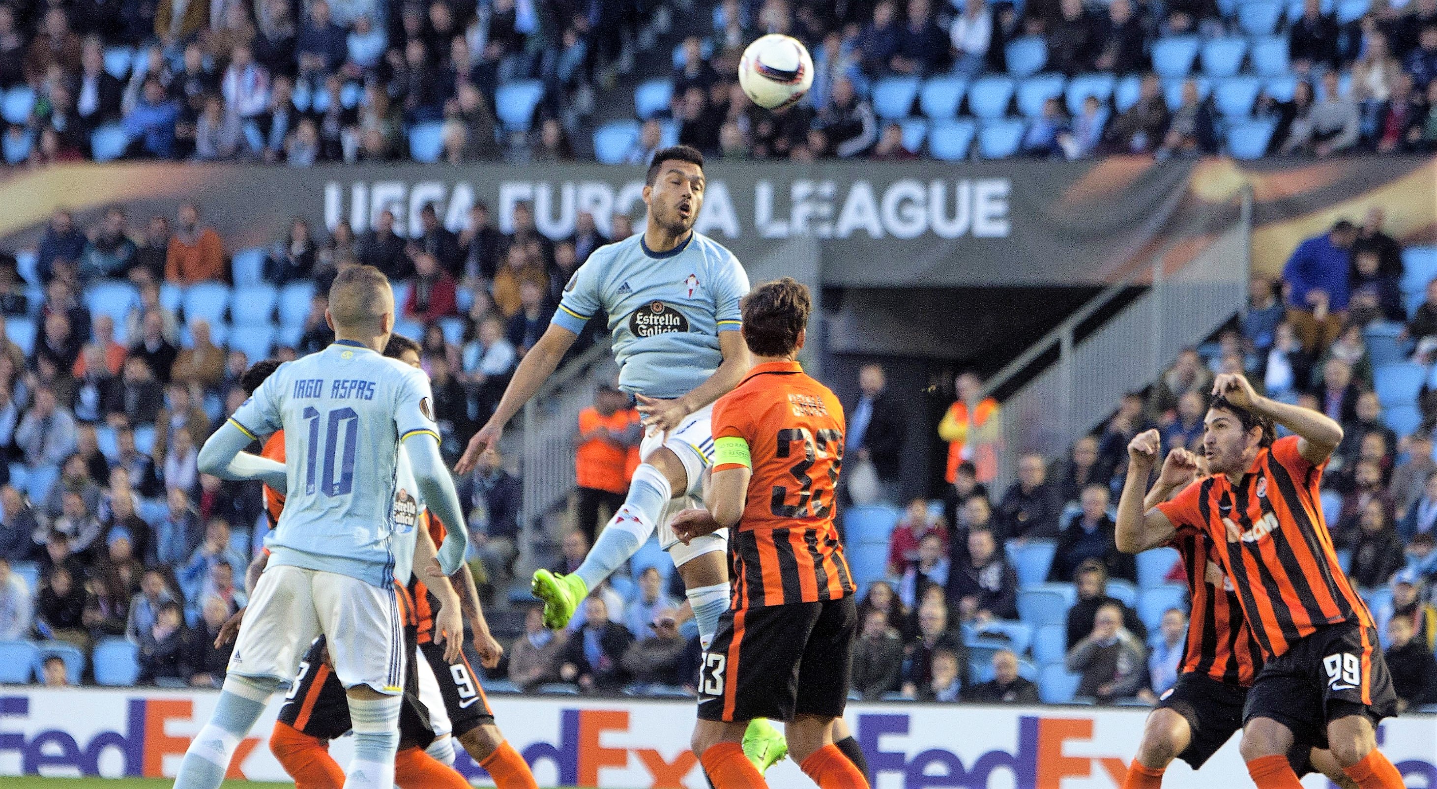 Sacó Eduardo Berizzo su versión más ofensiva en el equipo titular, con Guidetti como delantero centro, y en banda Bongonda y Aspas, aunque éste con más libertad de movimientos. El cuadro celeste marcó el ritmo en la primera parte. Sin asumir demasiados riesgos en el centro del campo, precavido ante la posibilidad del temido contragolpe del Shakhtar, el conjunto gallego tuvo la posesión: mucho orden, algún miedo a la aparición de errores y pocas oportunidades. Sólo tuvo una el Celta, clara: una pared entre Guidetti y Bongonda que finalizó con un lanzamiento muy alto del jugador belga a cinco metros de la portería.