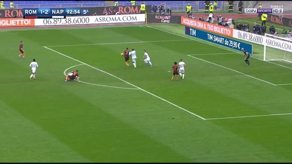 Reina reacciona a tiempo al rebote del disparo que toca en su compañero Kalidou Koulibaly y cambia la trayectoria. Además de parar el envenenado disparo, Reina sacó sus dotes arácnidos y consiguió con su pierna evitar que el rechace quedara muerto en área chica donde ya se preparaban dos delanteros de la Roma para engatillar al guardameta.