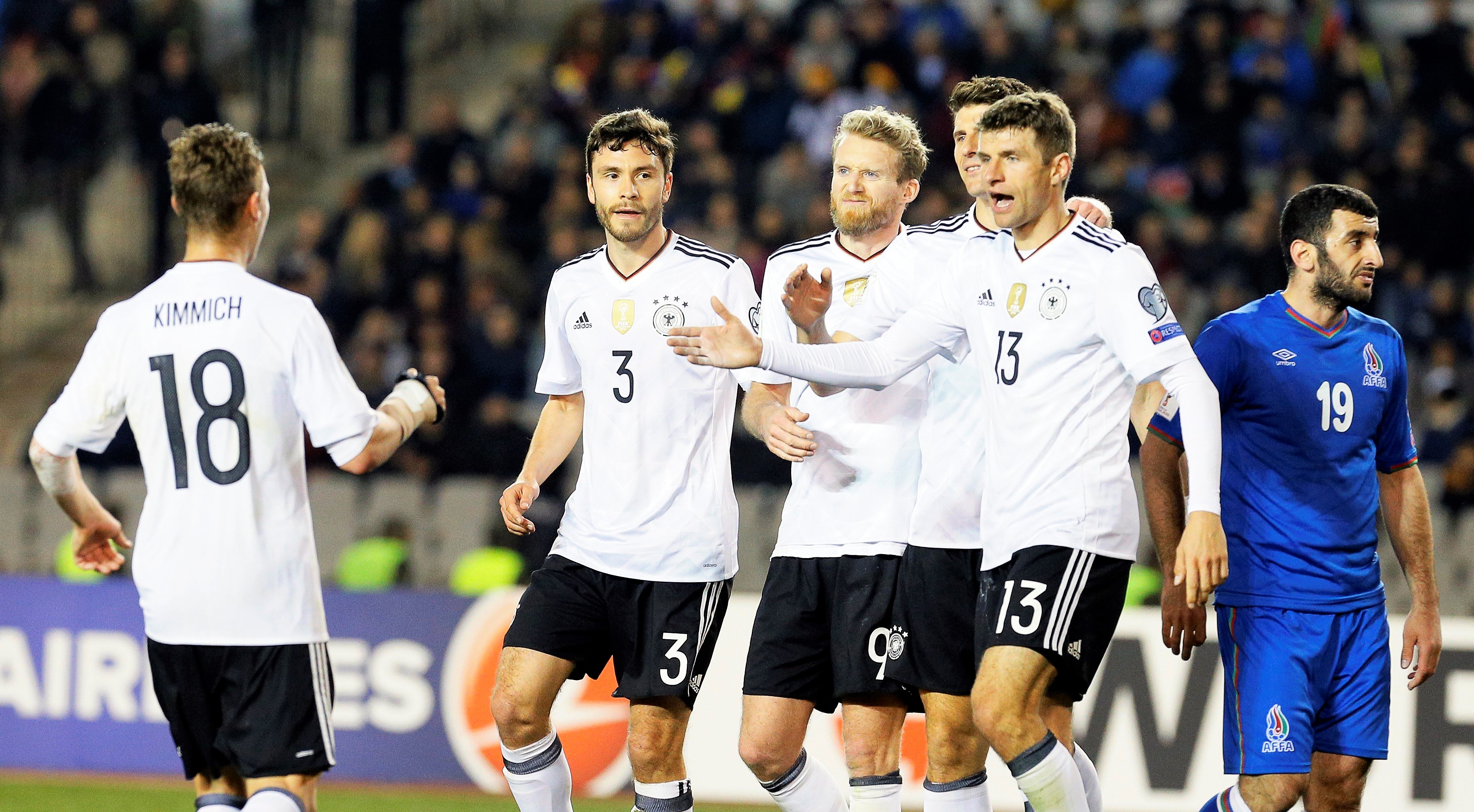 El haber encajado el primer gol en contra en lo que va de eliminatoria es el único lunar para la Mannschaft en el partido disputado en Bakú. Andre Schürrle, con un doblete, fue el encargado de abrir y cerrar la cuenta para el conjunto teutón, que también contó con el acierto goleador de Thomas Müller y Mario Gómez, mientras que Dimitri Nazarov marcó el único tanto del equipo local, que dirige el exjugador madridista Robert Prosinecki, llegando a poner el empate provisional en el marcador.