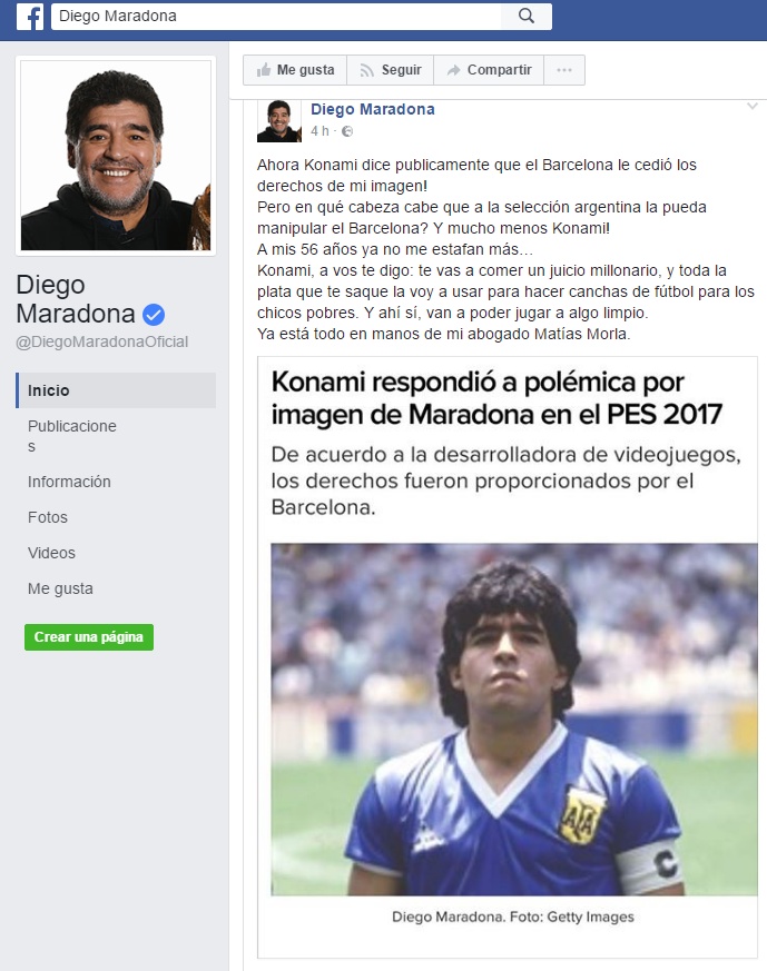 Se recrudece la guerra entre Diego Armando Maradona y la compañía japonesa Konami debido a la utilización de la imagen del exfutbolista argentino en el videojuego Pro Evolution Soccer (PES) 2017.