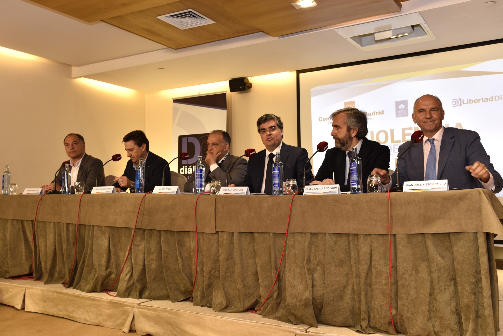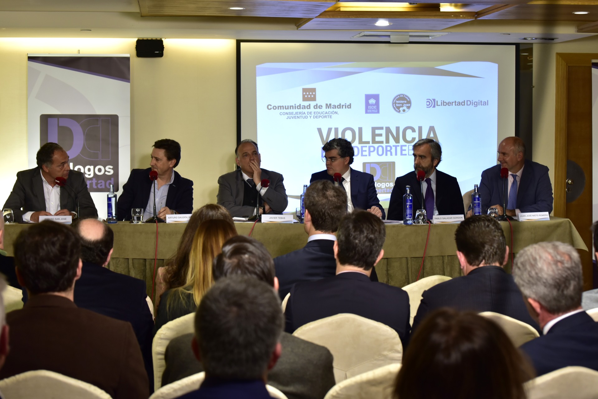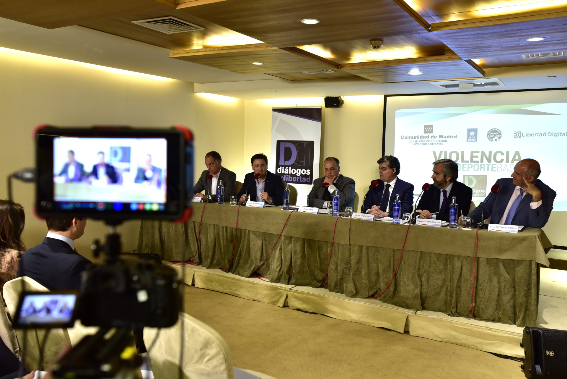 Jornadas en Libertad Digital sobre la violencia en el deporte base con la presencia de Pablo Salazar, director general de Deportes de la Comunidad de Madrid; Juan José Nieto, director general de Enseñanza infantil, primaria y secundaria; Javier Tebas, presidente de la Liga de Fútbol Profesional; Isidoro San José, exjugador del Real Madrid y colaborador de esRadio; y Arturo Daudén Ibáñez, exárbitro internacional.