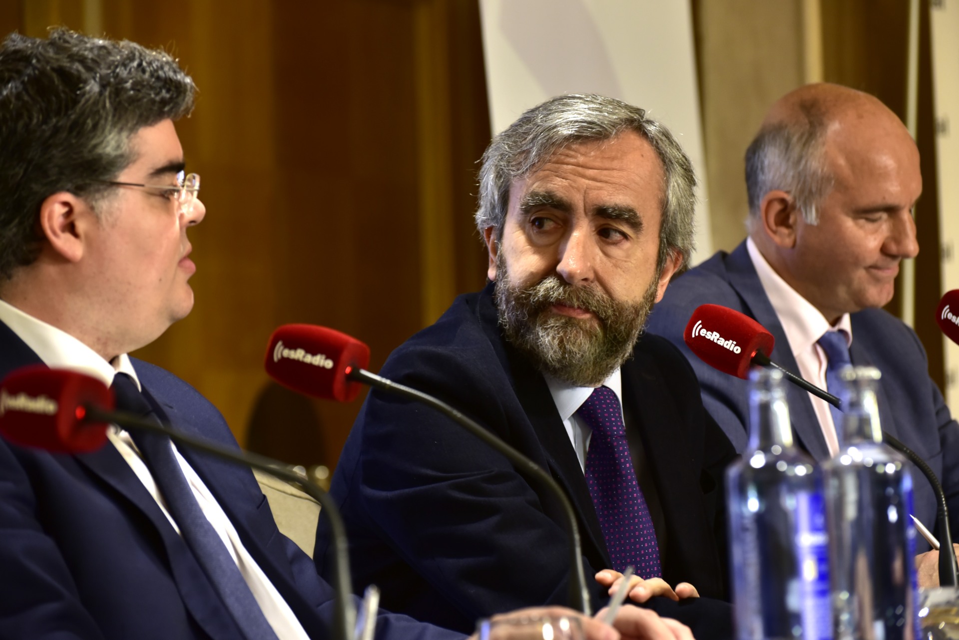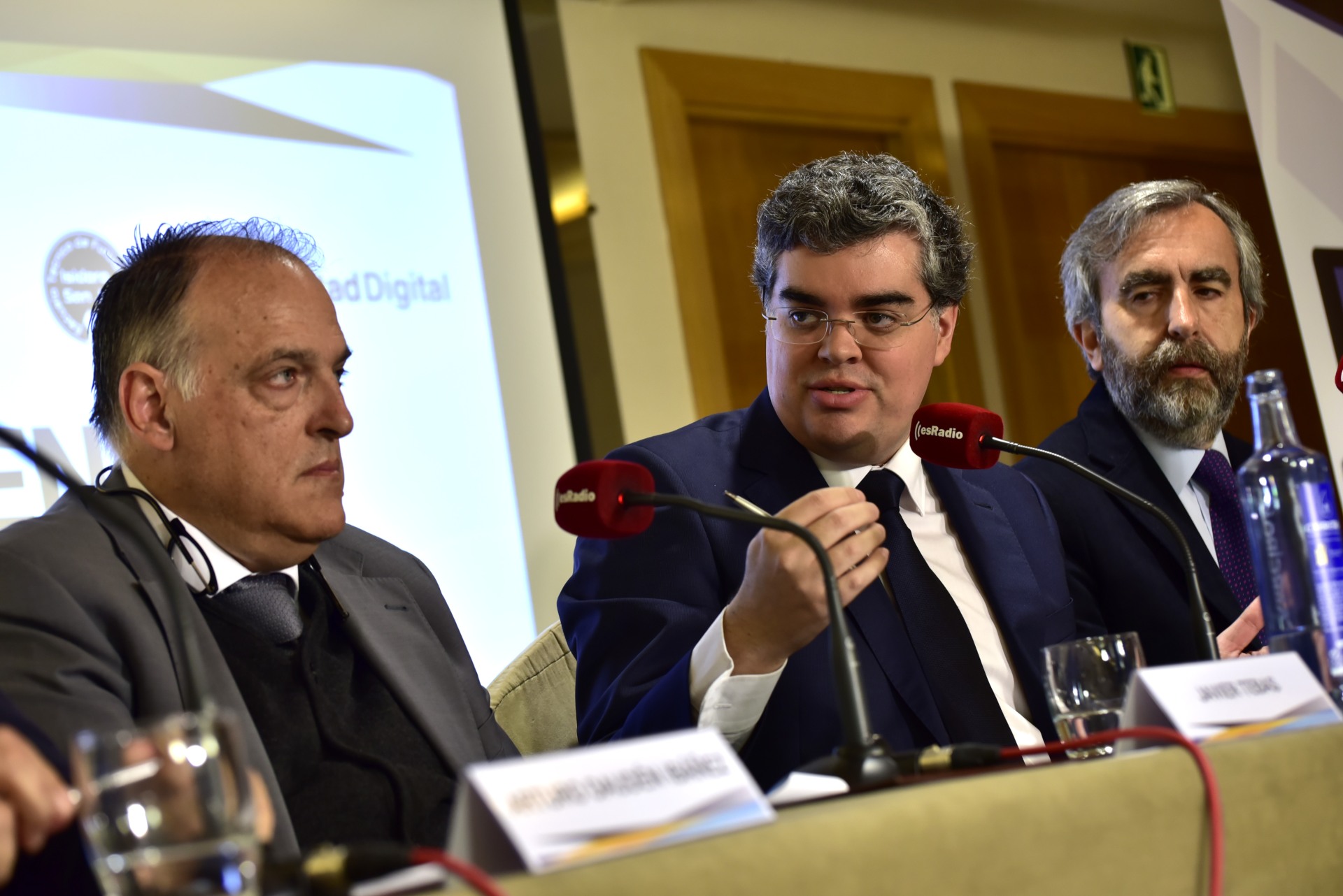 Javier Tebas, presidente de la Liga, escucha la introducción que corrió a cargo de Vicente Azpitarte, jefe de deportes del grupo Libertad Digital, junto a Pablo Salazar Gordon, director general de Juventud y Deporte de la Comunidad de Madrid.