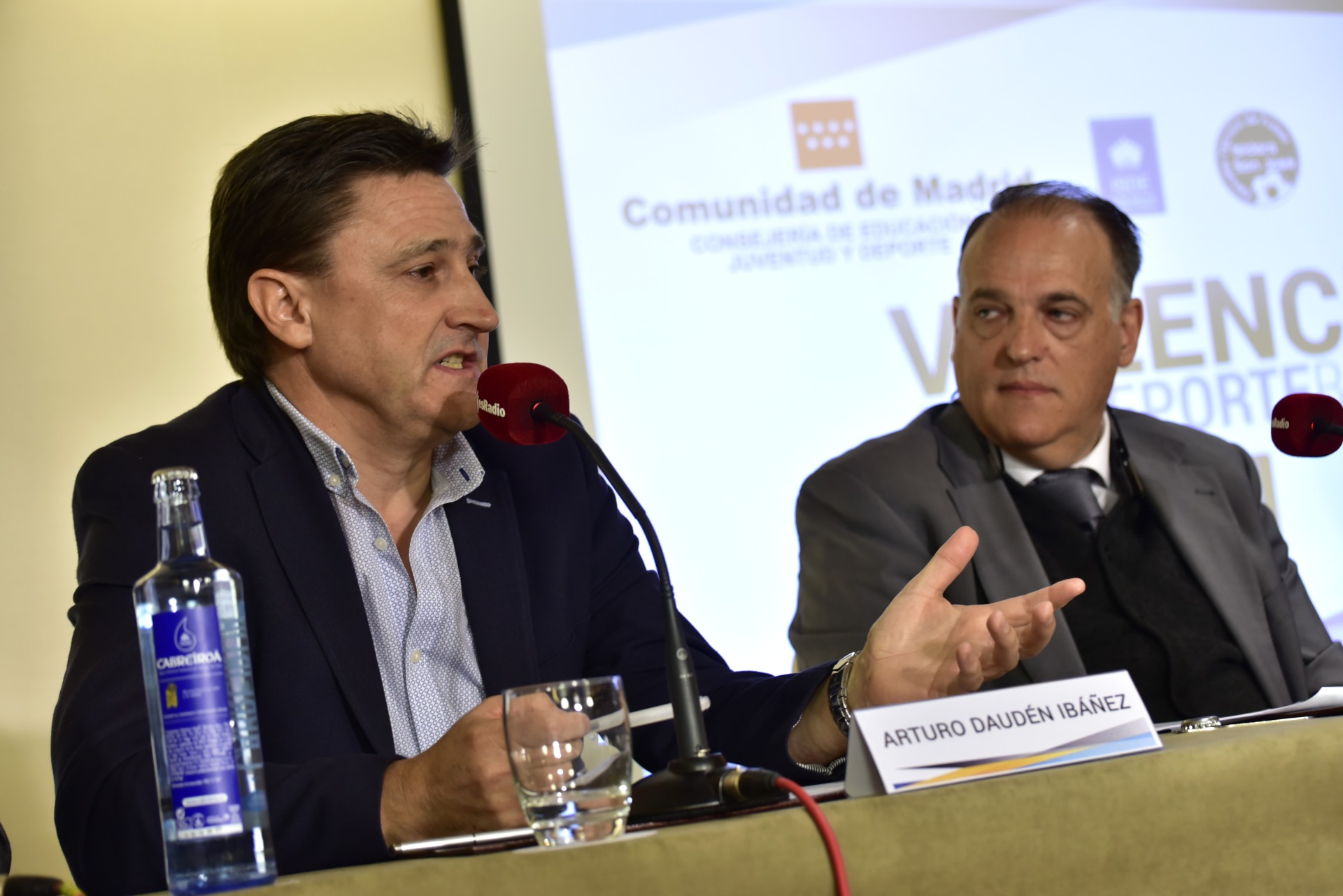 Mesa de ponentes: (i-d) El exjugador del Real Madrid y de la Selección Española Isidoro San José, el exárbitro internacional Arturo Daudén Ibáñez, el presidente de la LFP, Javier Tebas, el moderador y jefe de deportes del grupo Libertad Digial Vicente Azpitarte, el director general de Juventud y Deporte de la Comunidad de Madrid Pablo Salazar Gordon y el director general de Enseñanza Infantil, Primaria y Secundaria de la Comunidad de Madrid, Juan José Nieto Romero.