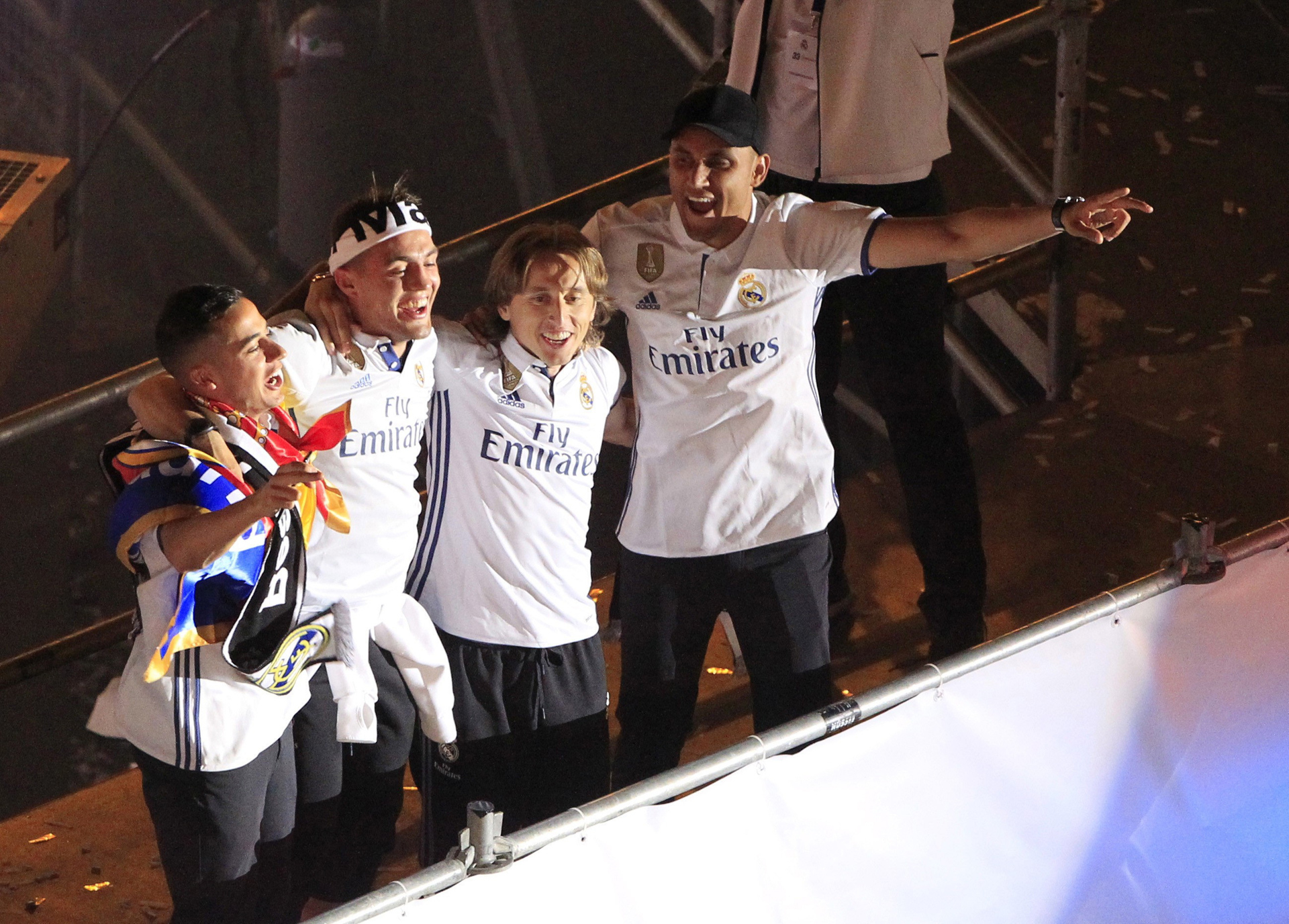 Los jugadores del Real Madrid (i-d) Lucas Vazquez, Kovacic, Luka Modric y Keylor Navas, durante la celebración del título de liga, esta noche en la madrileña plaza de Cibeles.