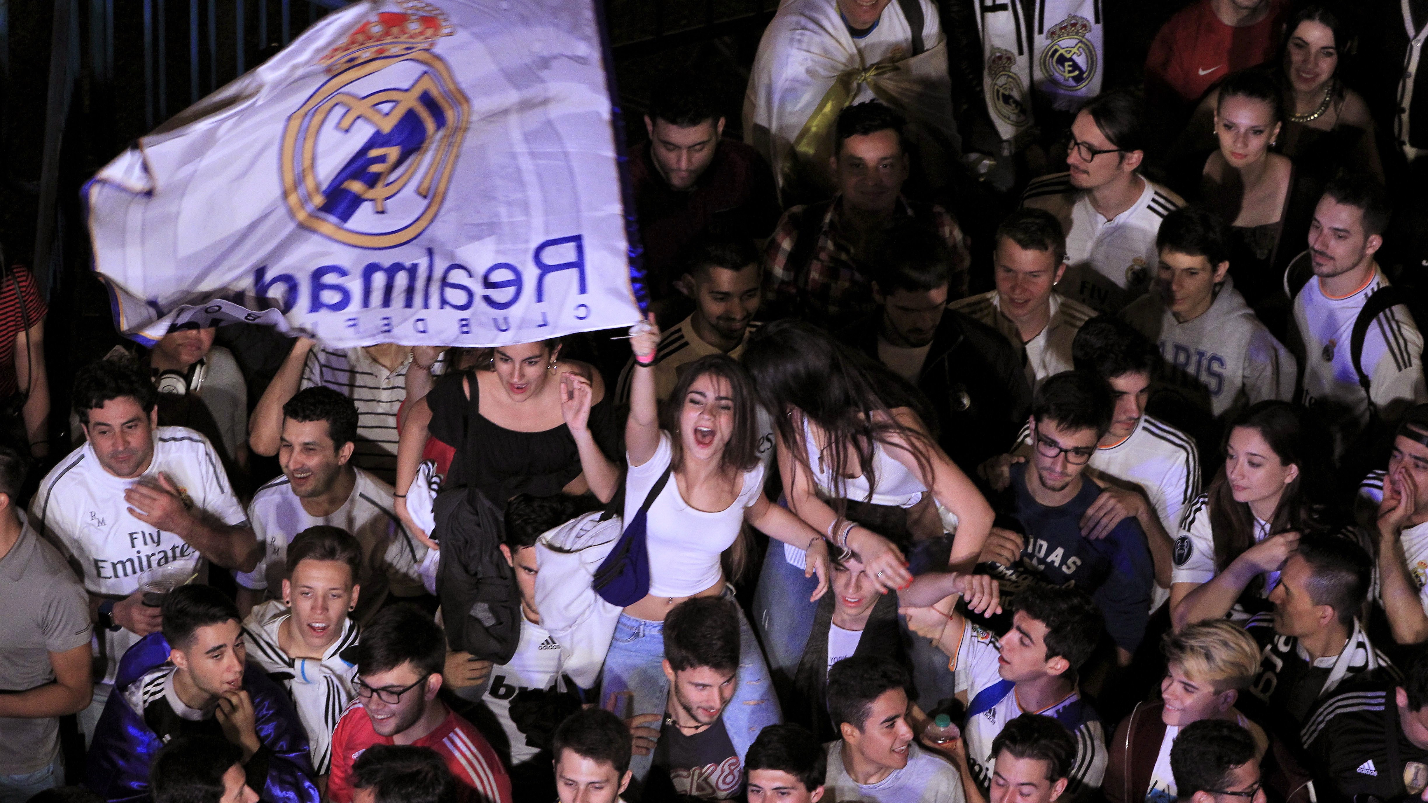 Una aficionada del Real Madrid porta la bandera de su equipo en plena fiesta de los campeones.