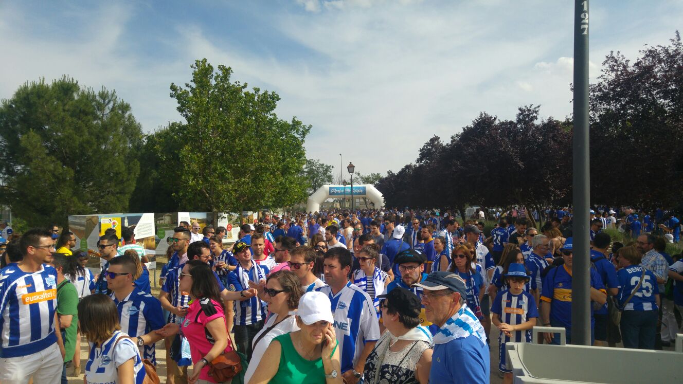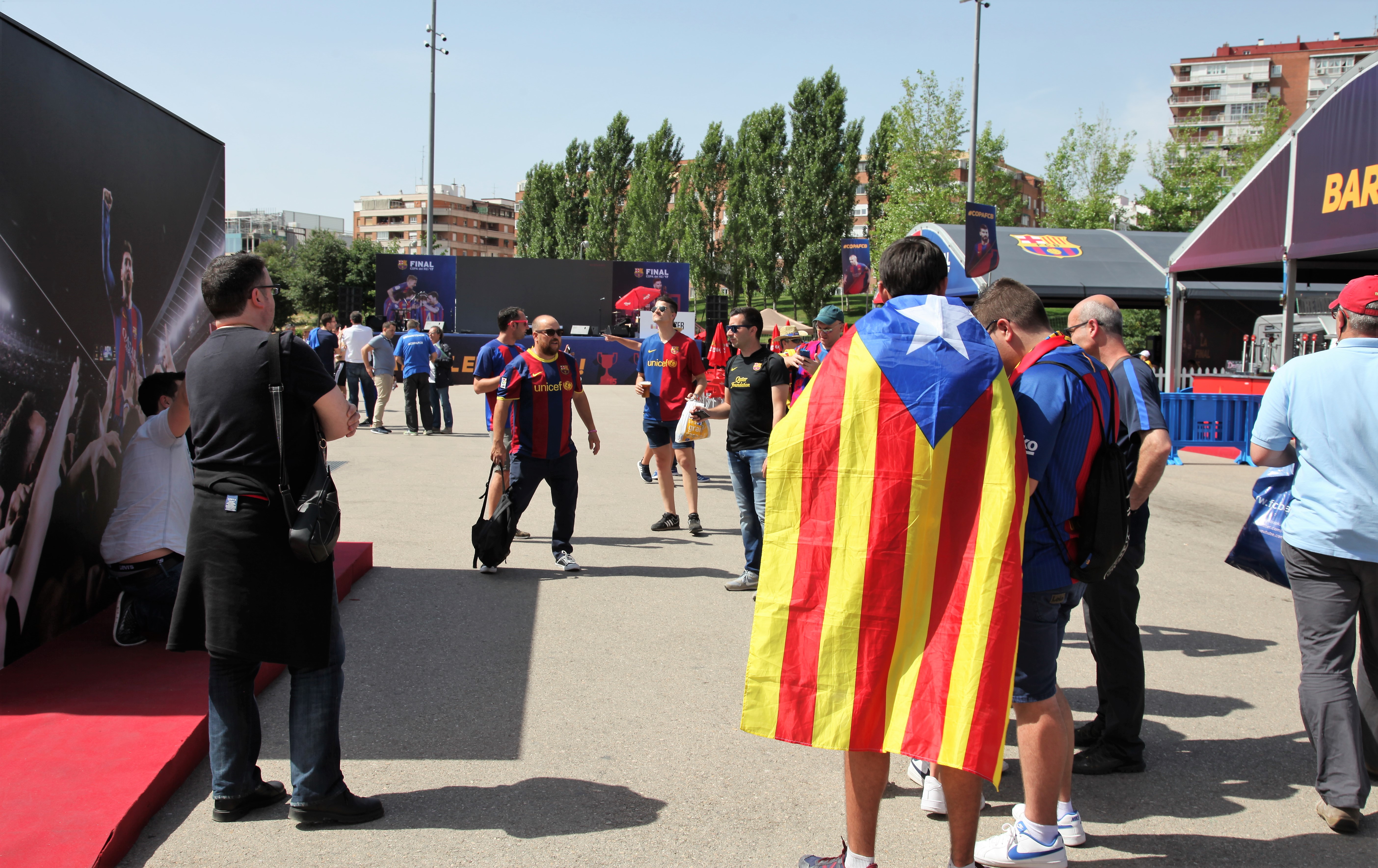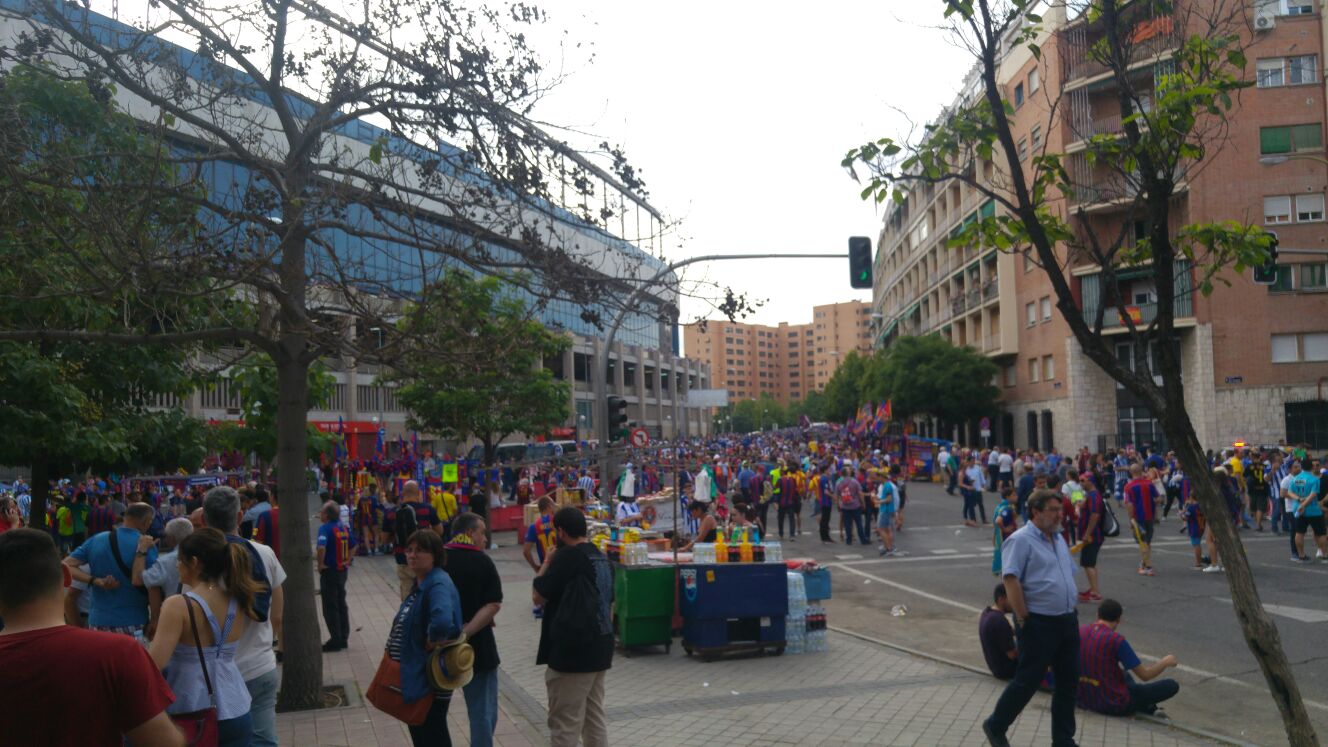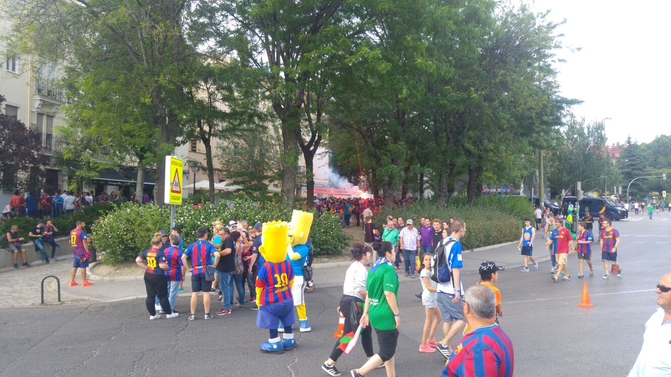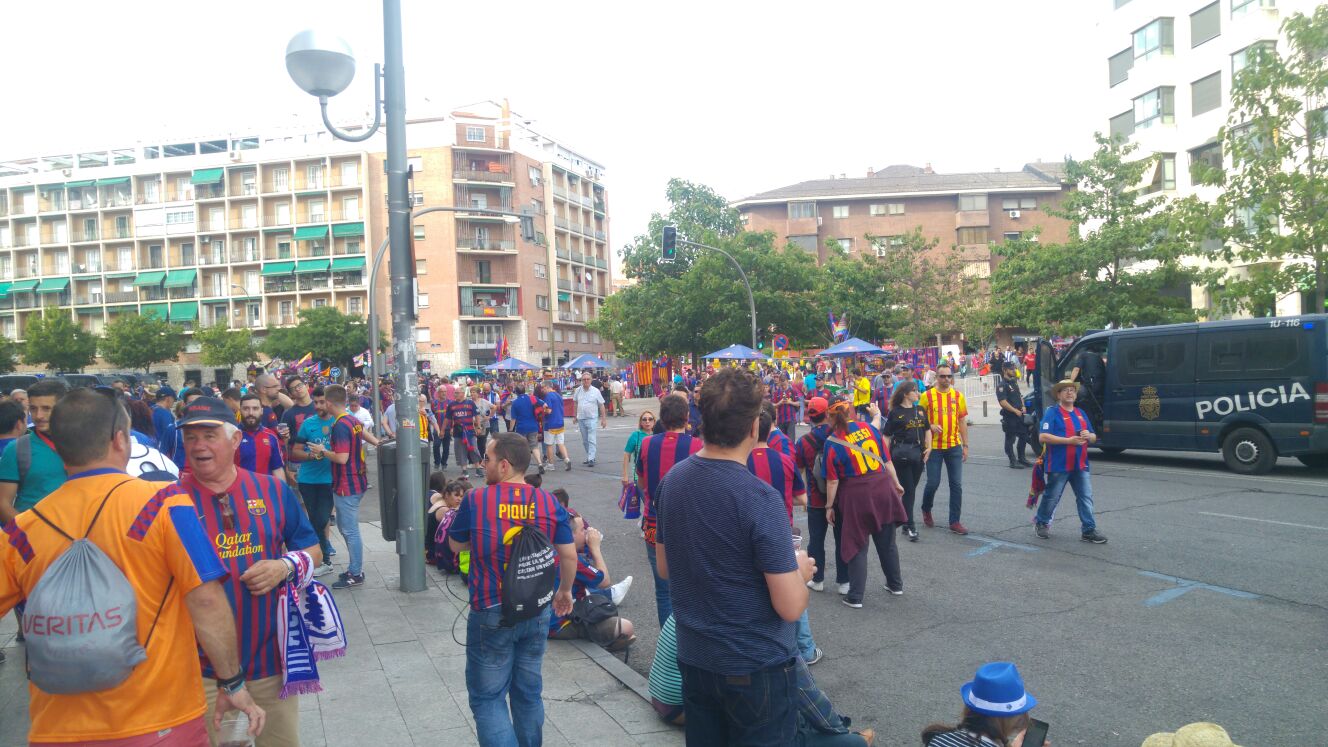 Buen ambiente entre las aficiones de FC Barcelona y Deportivo Alavés en las horas previas a la final de Copa del Rey que enfrenta a ambos equipos en el estadio Vicente Calderón.