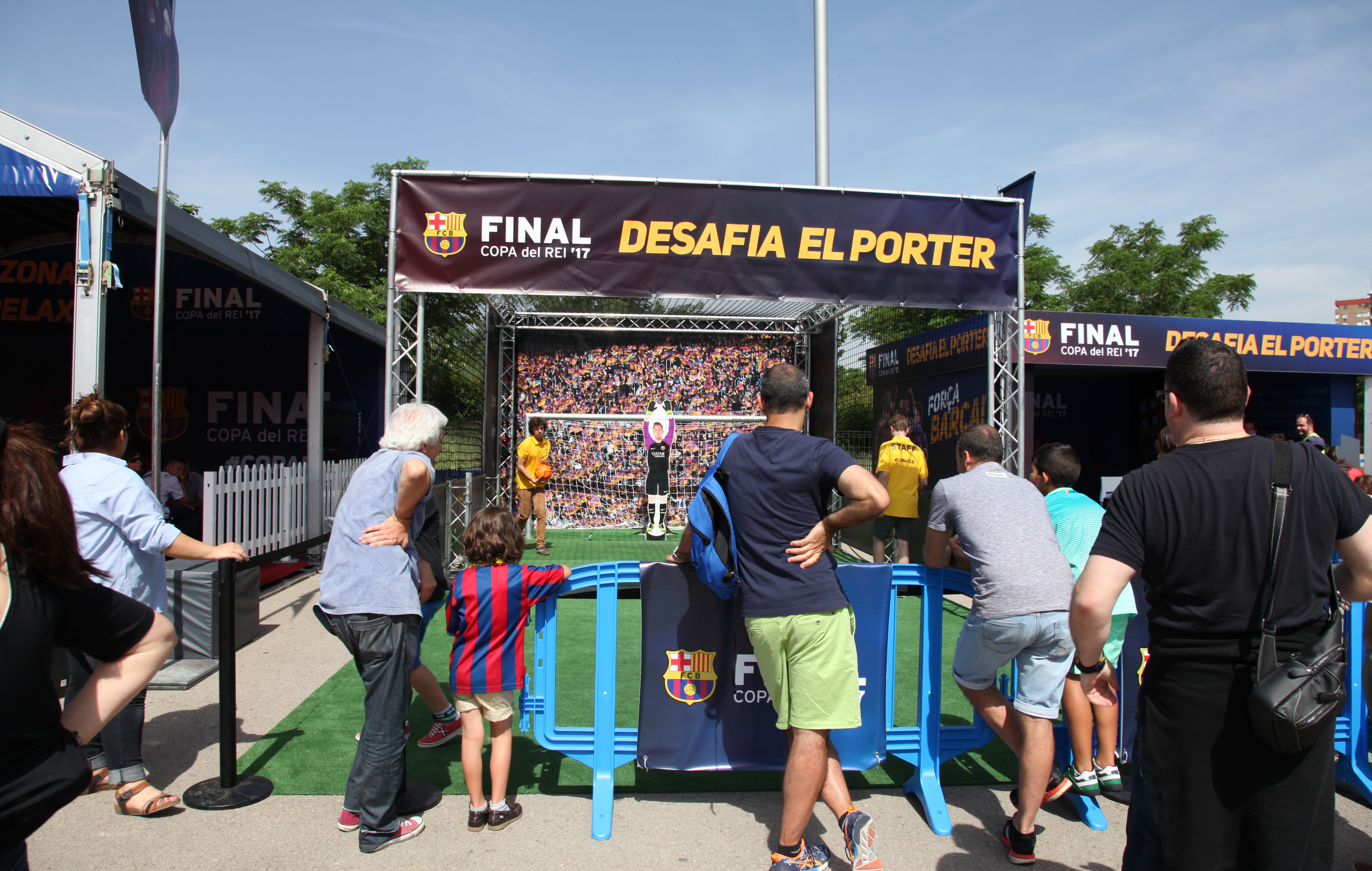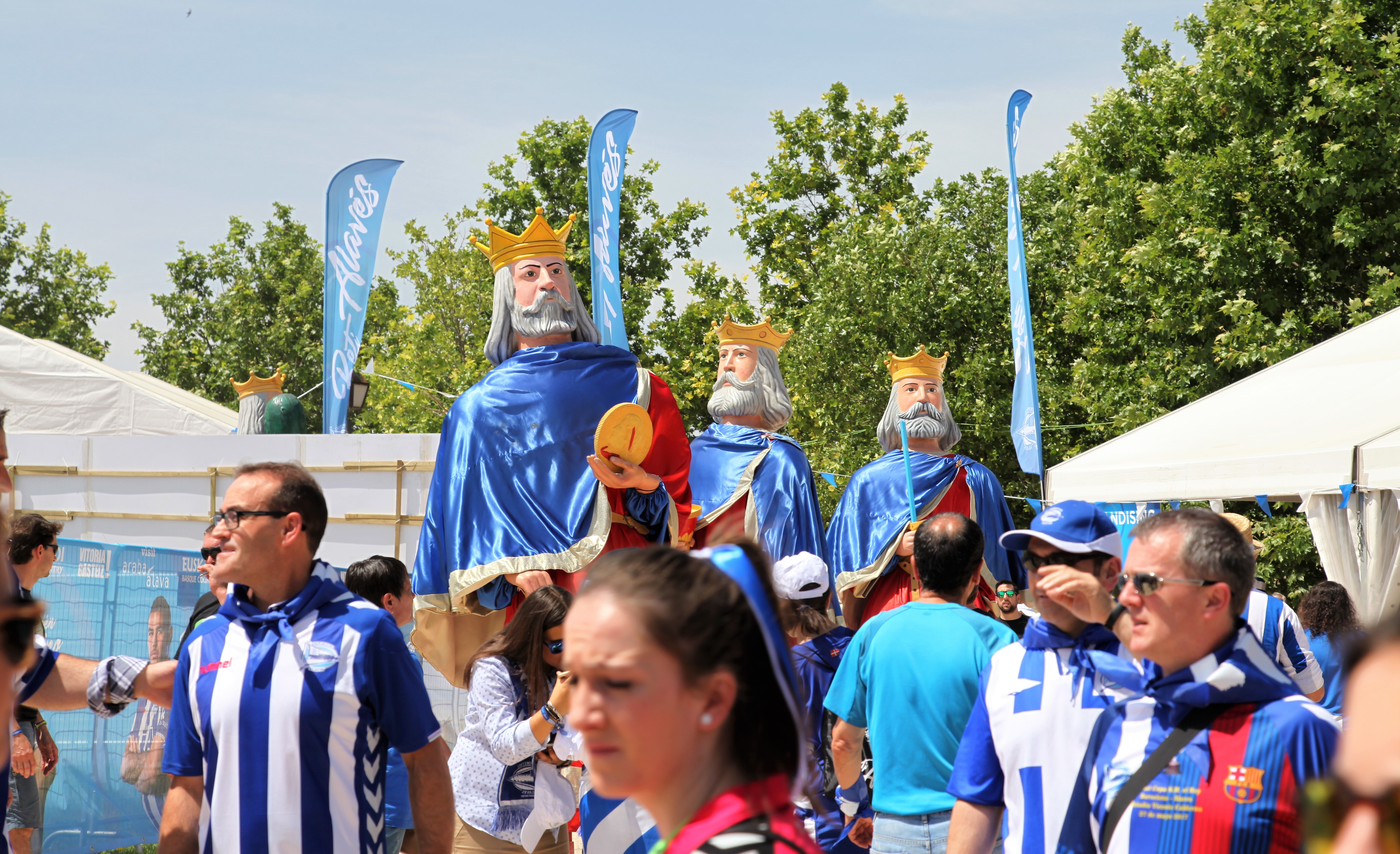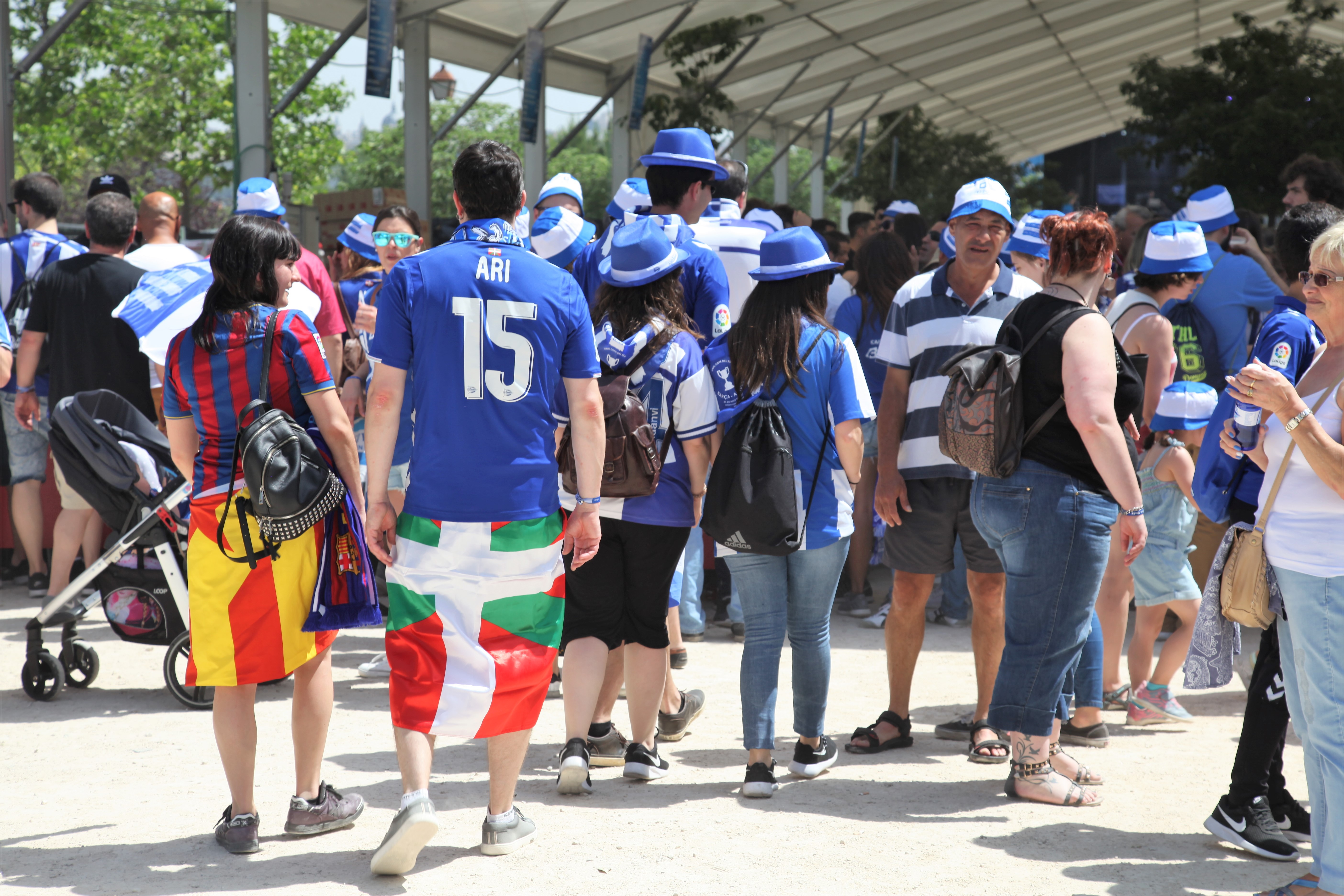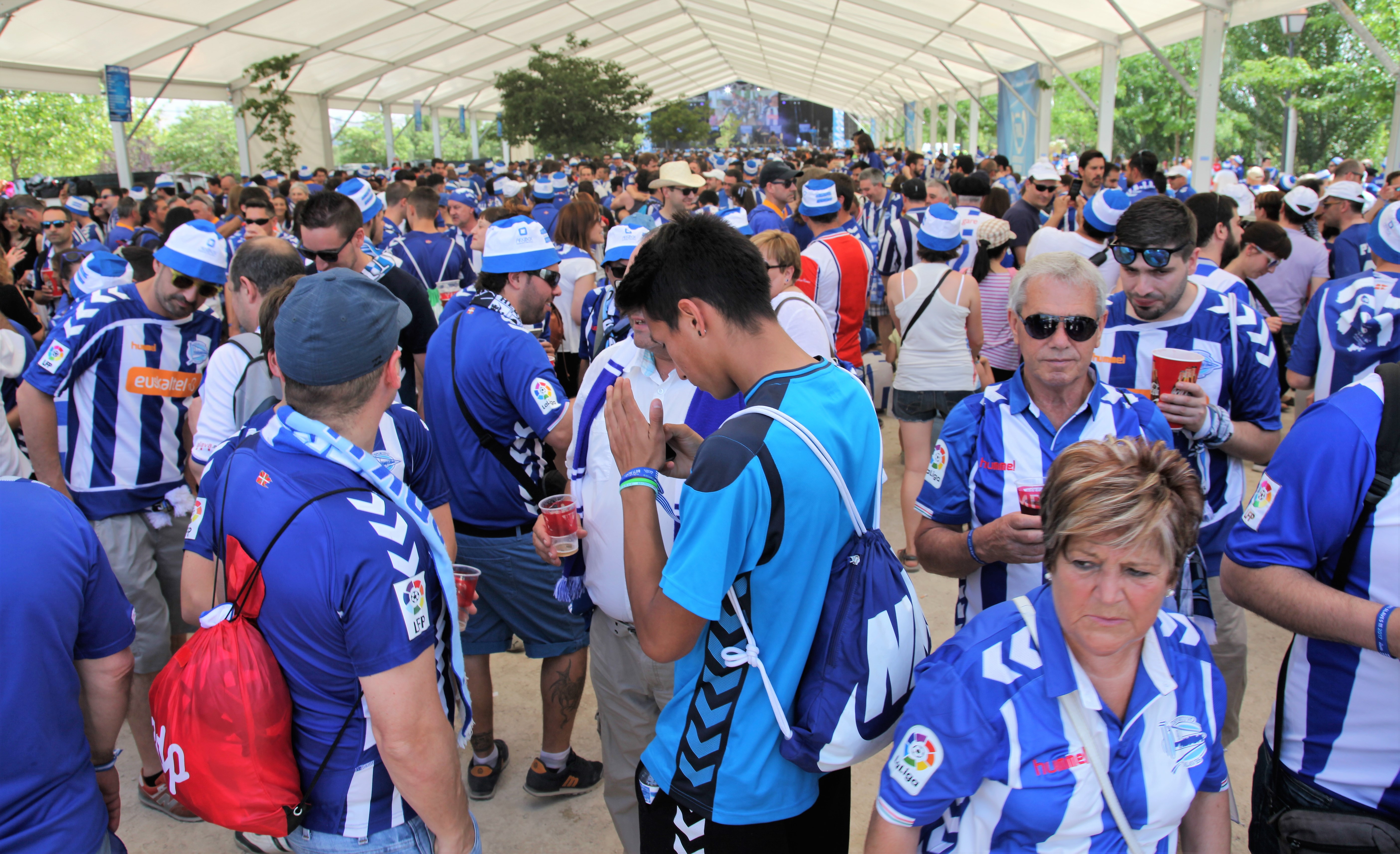 Buen ambiente entre las aficiones de FC Barcelona y Deportivo Alavés en las horas previas a la final de Copa del Rey que enfrenta a ambos equipos en el estadio Vicente Calderón.