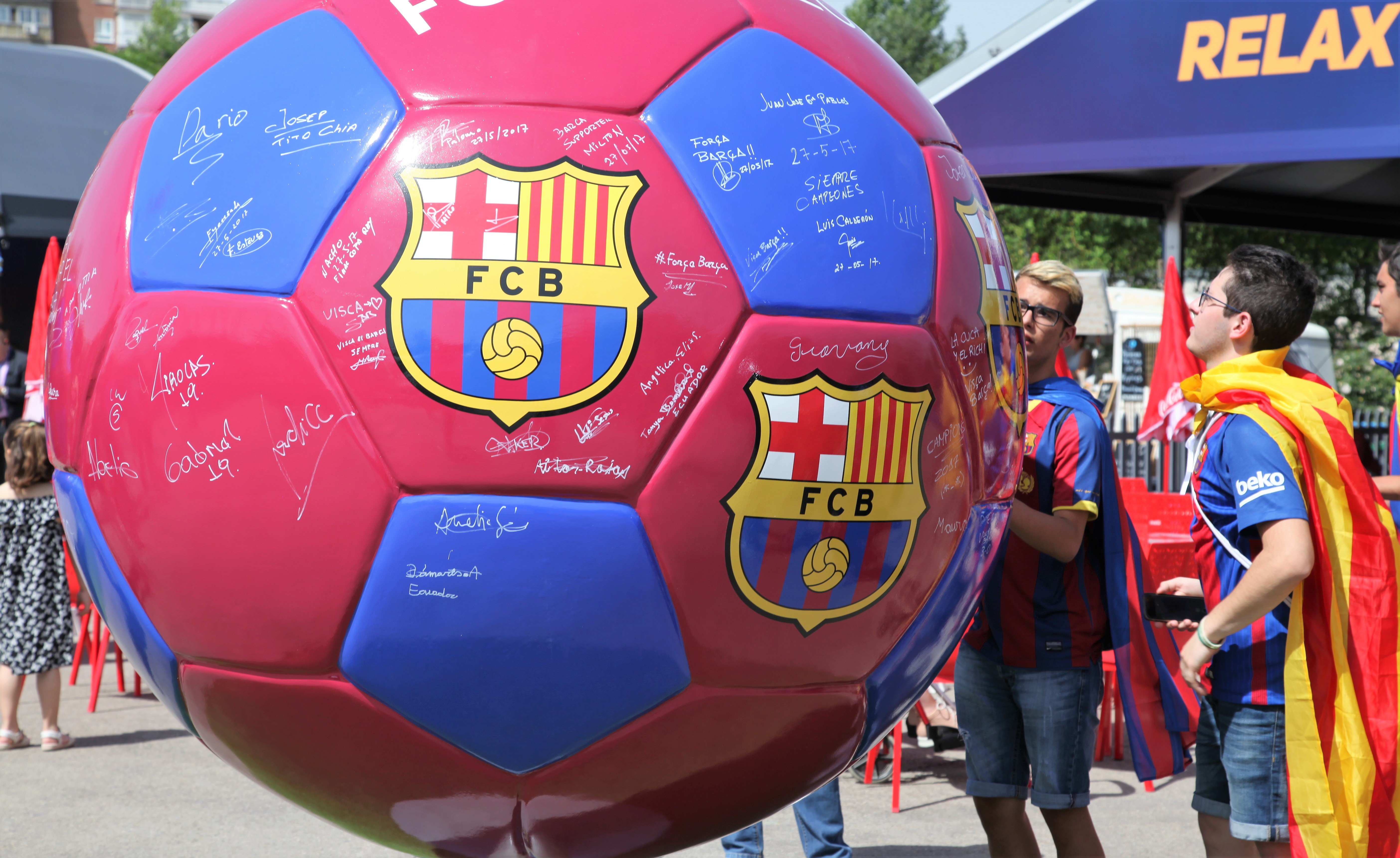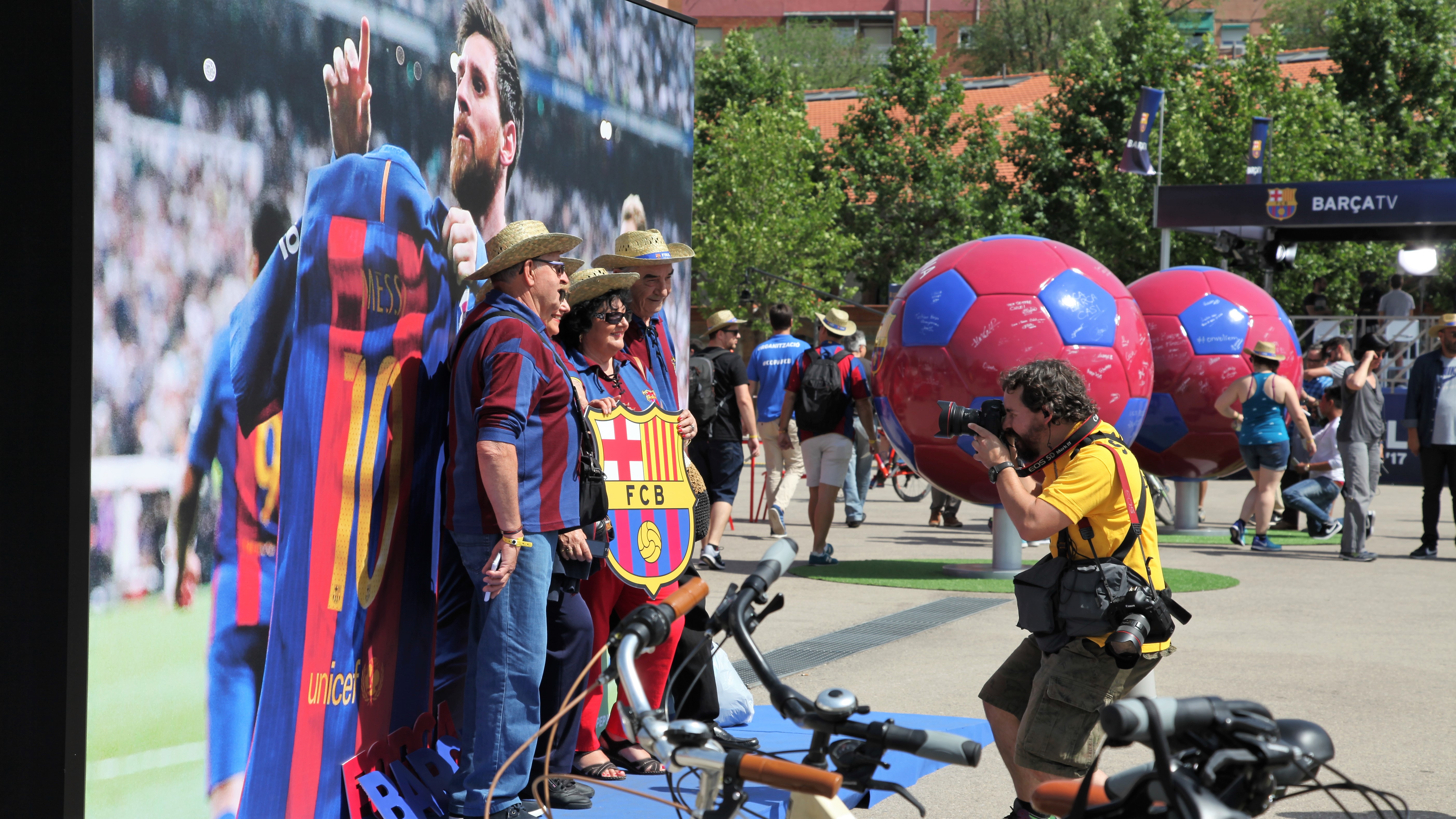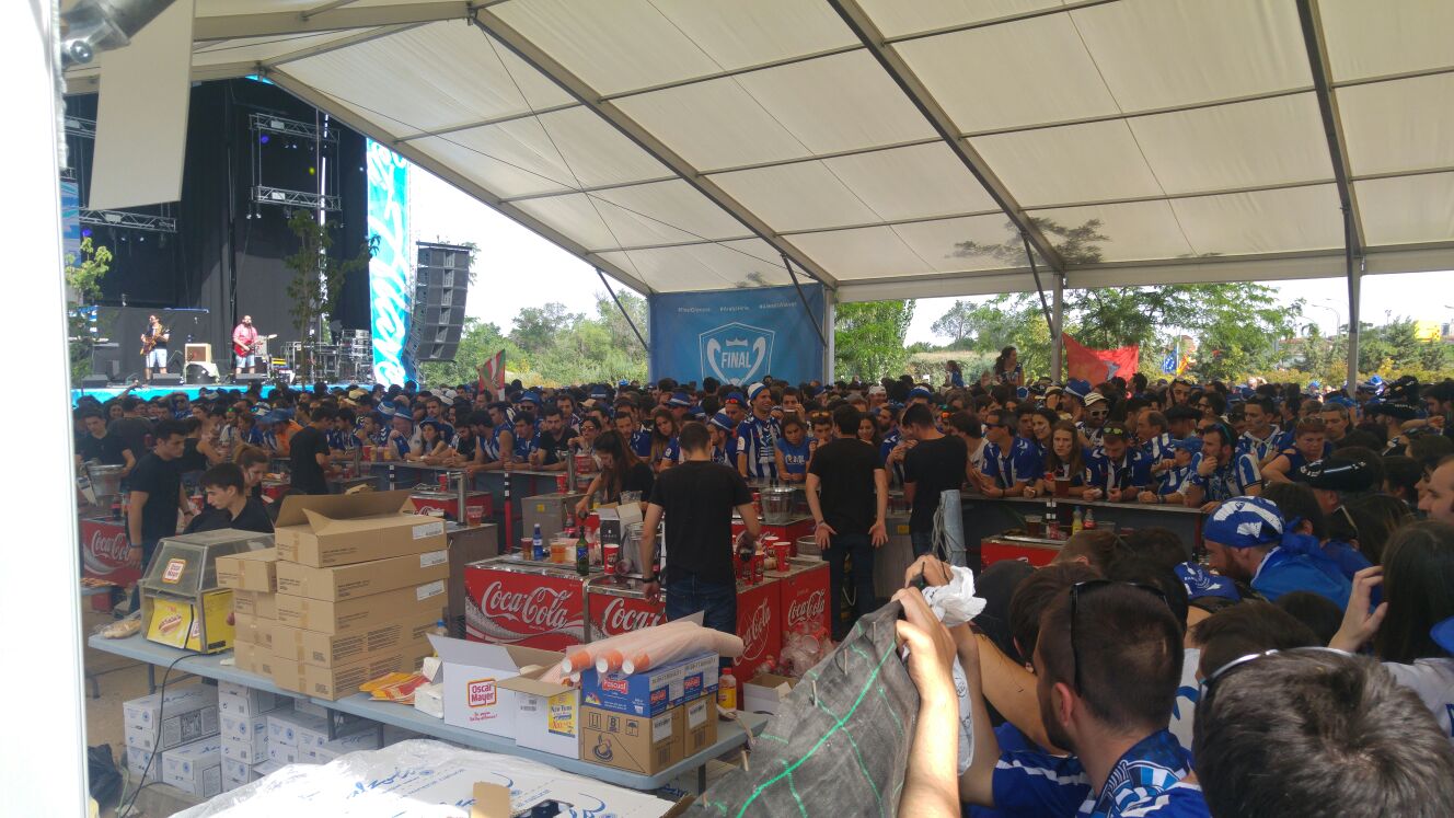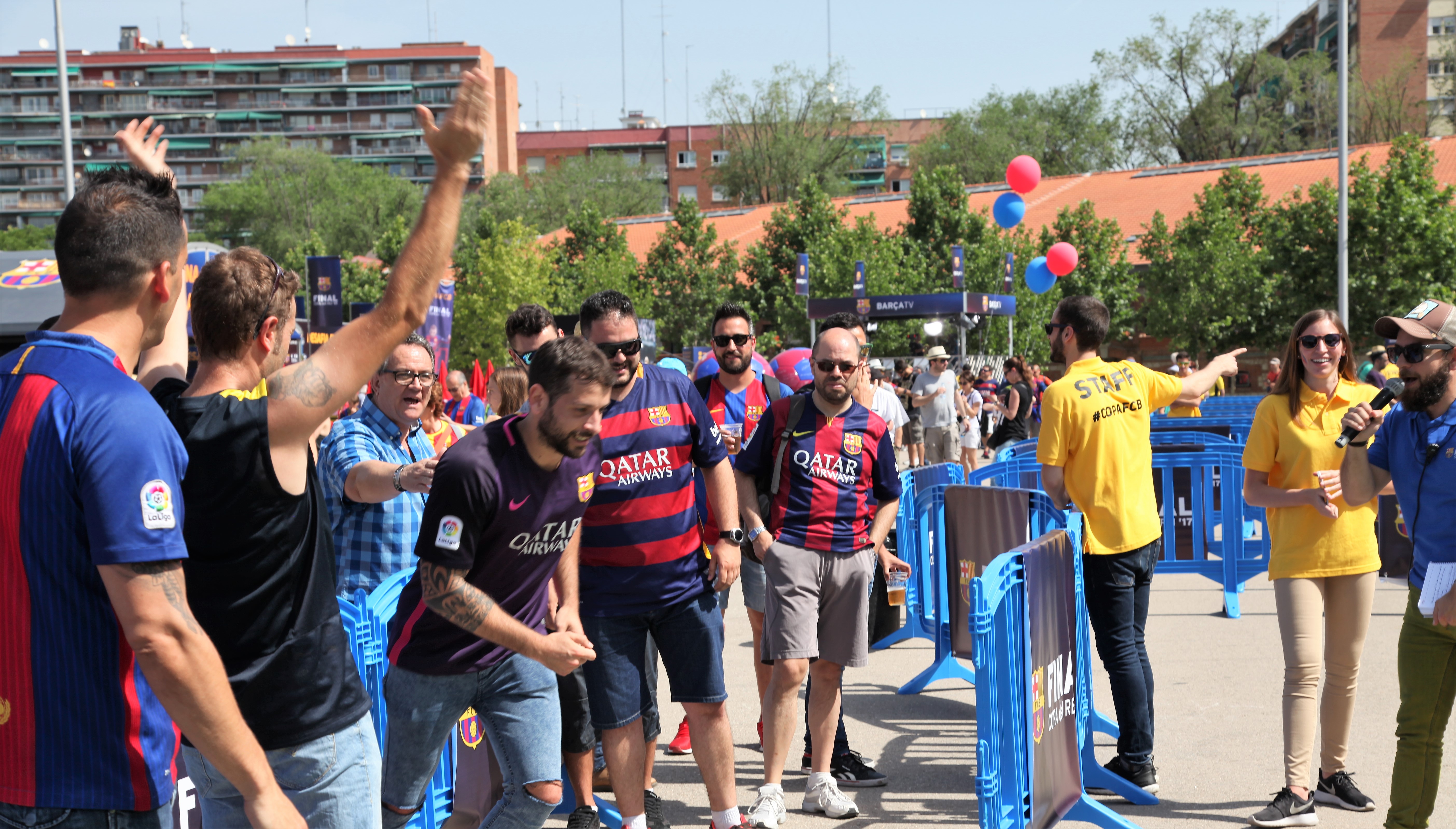 Buen ambiente entre las aficiones de FC Barcelona y Deportivo Alavés en las horas previas a la final de Copa del Rey que enfrenta a ambos equipos en el estadio Vicente Calderón.