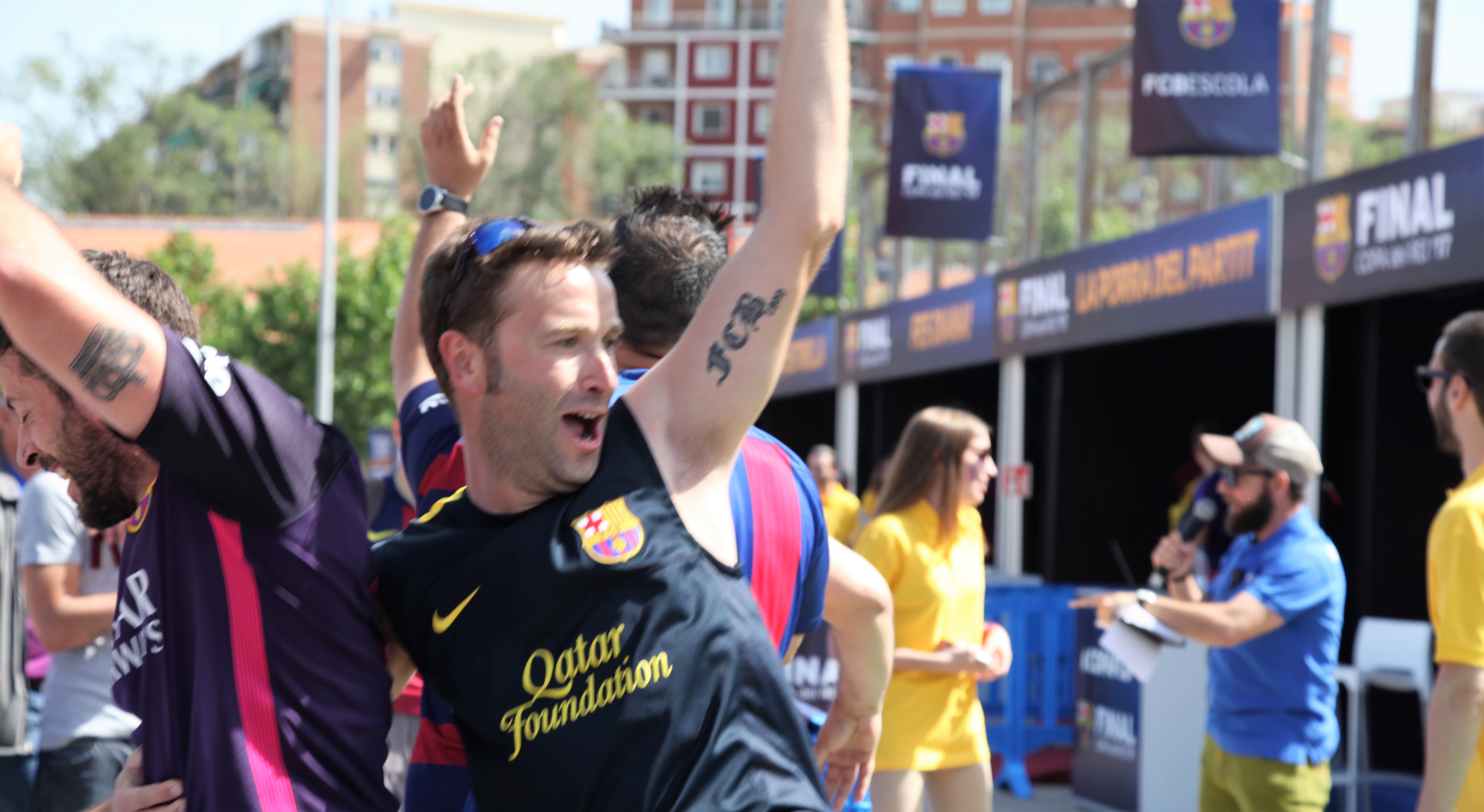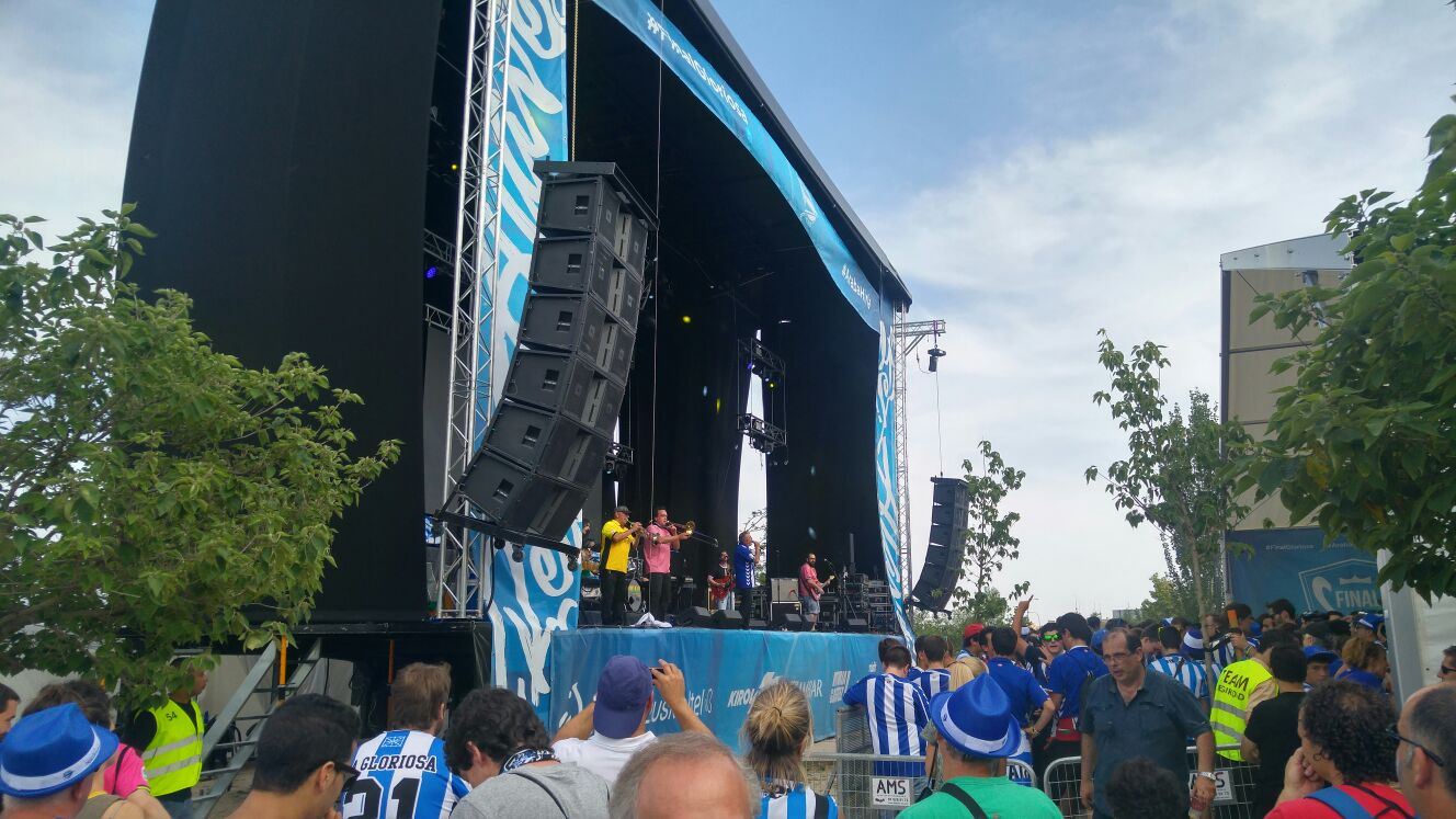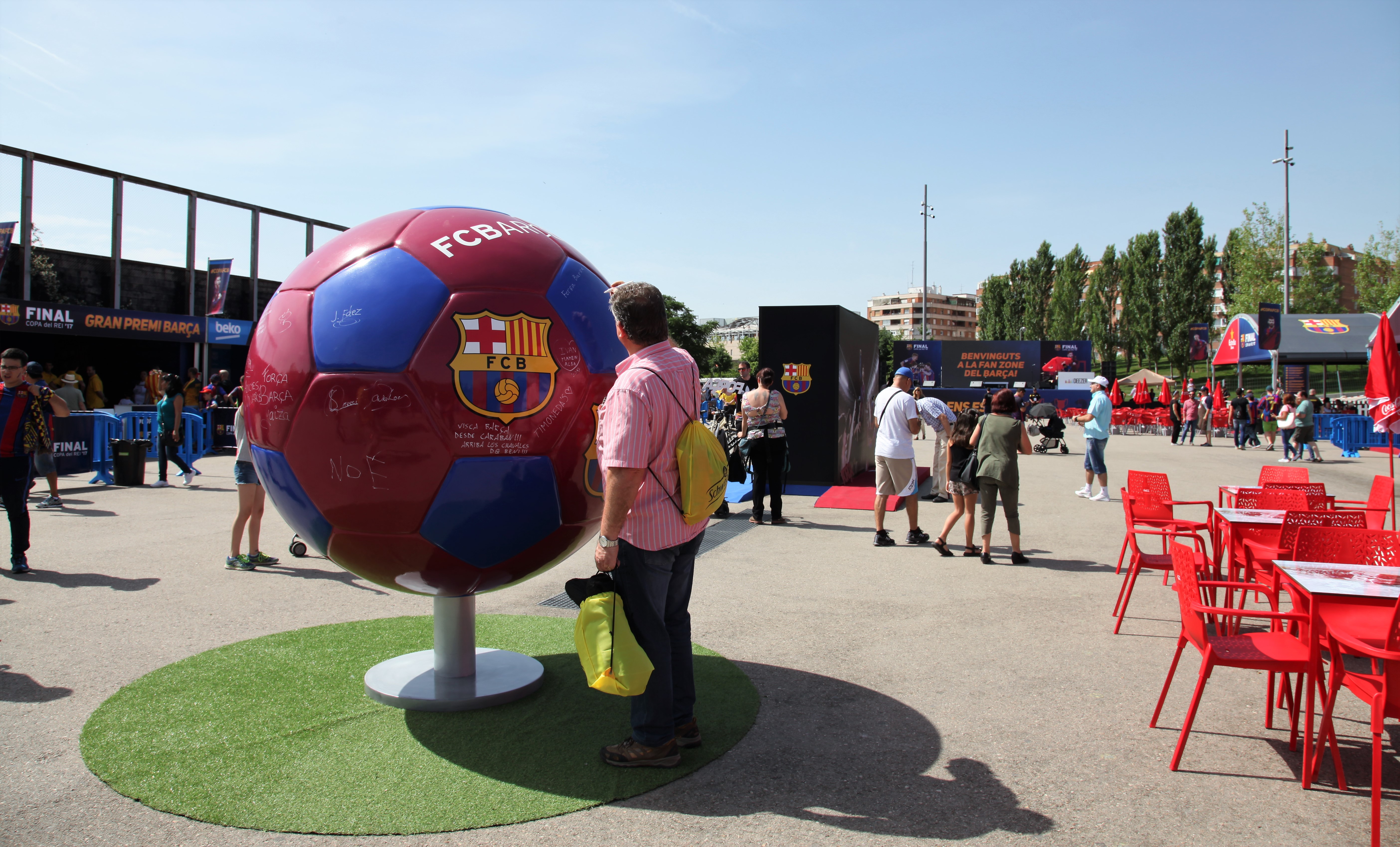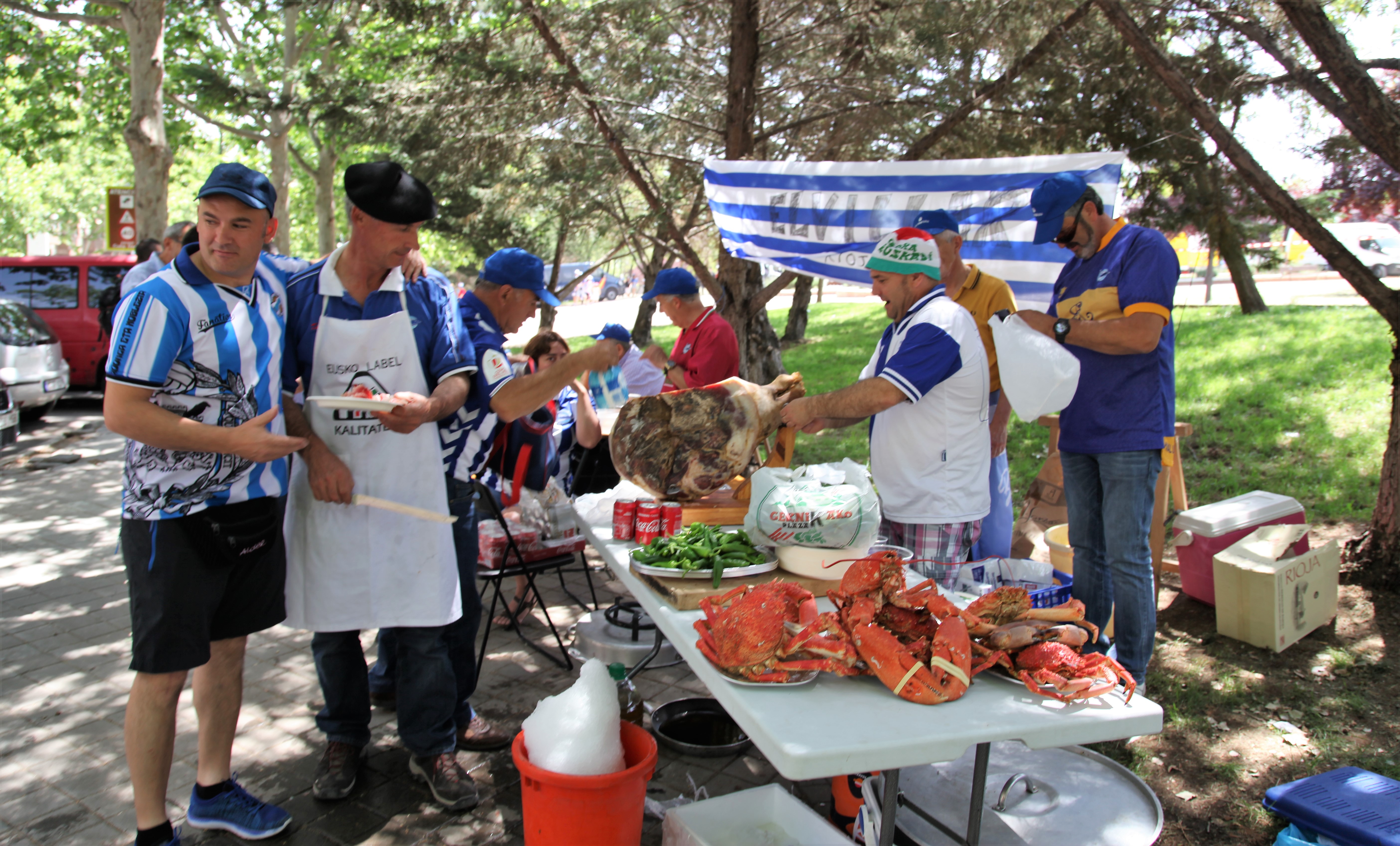 Buen ambiente entre las aficiones de FC Barcelona y Deportivo Alavés en las horas previas a la final de Copa del Rey que enfrenta a ambos equipos en el estadio Vicente Calderón.