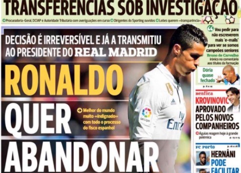 Así de contundente se muestra la publicación portuguesa hablando de una posible salida de Ronaldo del Real Madrid tras los problemas que ha tenido en los últimos días con la Hacienda española por un supuesto fraude fiscal.