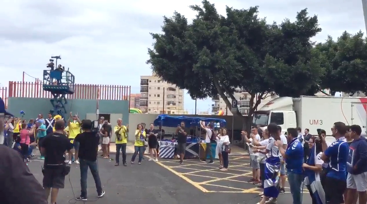Los aficionados del Cádiz, aplaudidos por seguidores del Tenerife, momentos antes del partido de vuelta de semifinales del playoff de ascenso disputado en el Heliodoro Rodríguez López.