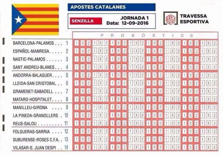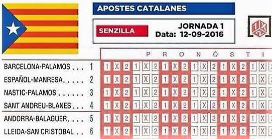 Por las redes sociales y Whatsapp está circula estos días, a poco más de tres semanas del referéndum ilegal del 1 de octubre en Cataluña, una quiniela ficticia correspondiente a ese territorio en la que se puede ver partidos como el Suburense-Roses, Gramenet-Sabadell, Mataró-Hospitalet o La Pineda-Granollers, entre otros, mientras que el FC Barcelona se enfrentaría al Palamós, el Espanyol al Manresa y el Girona al Manlleu.