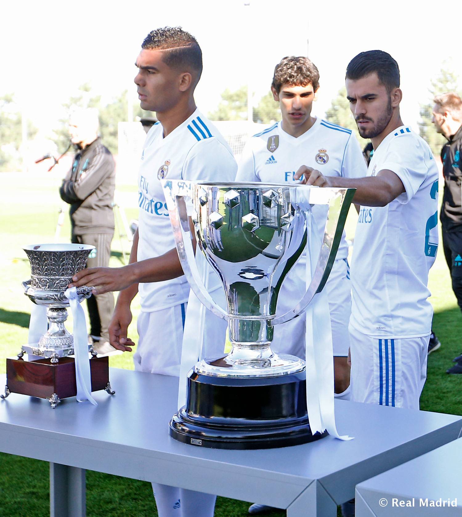 Dani Ceballos, Jesús Vallejo y Casemio junto a los trofeos de la temporada pasada