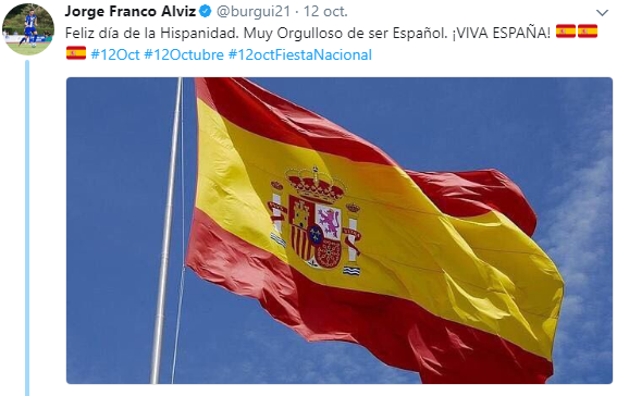 Burgui, excanterano del Real Madrid y actual jugador del Alavés, no tuvo ningún tipo de reparo y ejerció su libertad de expresión para celebrar en la red social Twitter y para acompañar al resto de españoles en la fiesta del Día de la Hispanidad del pasado 12 de octubre. Hasta aquí todo normal e incluso necesario en los días que el país está viviendo últimamente.