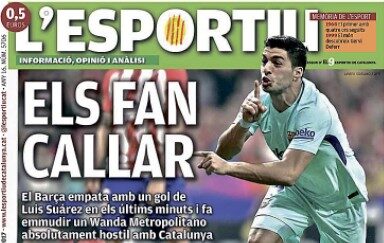 El diario L´Esportiu es un claro ejemplo de como el simple hecho de llevar una bandera de España se considera un recibimiento hostil en algunos sectores de Cataluña. El diario ilustra su portada con una foto de Suárez y con el titular "les hacen callar". A estas palabras añaden que el Metropolitano ofreció un ambiente "absolutamente hostil con Cataluña".