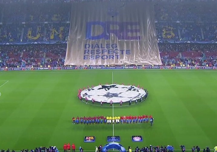 Y es que el club, en los minutos previos al partido ante Olympiacos, desplegó una pancarta enorme (45x46 metros) en la que se podían leer, en catalán, las palabras "Diálogo, Respeto y Deporte", en clara alusión a la situación política de Cataluña.