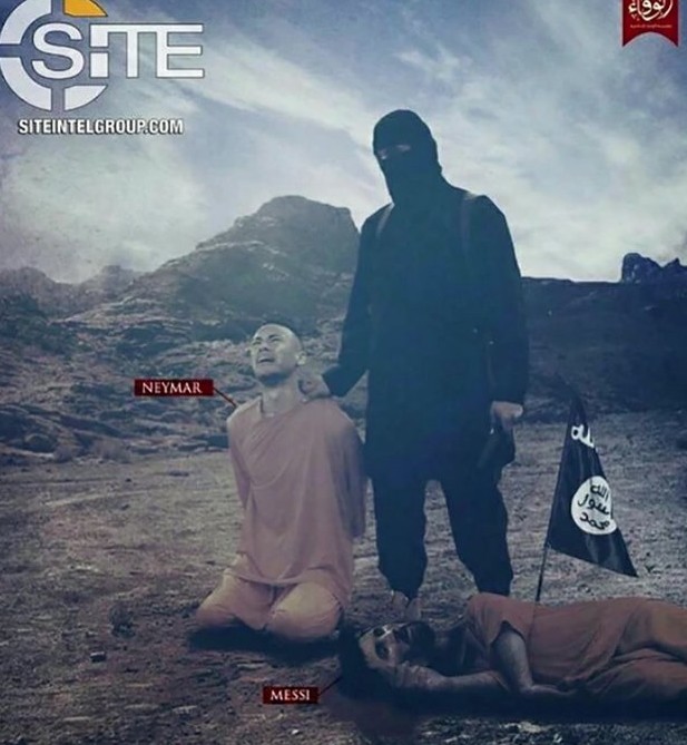Estado Islámico ha vuelto a escoger a Leo Messi para lanzar sus amenazas terroristas en las redes sociales. Apuntan directamente al Mundial de Rusia 2018, la cita que más estrellas del fútbol congregará este verano en un país que para ellos es enemigo acérrimo. Ahora han divulgado dos nuevos carteles: en uno amenazan al seleccionador francés, Didier Deschamps, y en el otro muestran a Messi muerto en el suelo y a su amigo Neymar —exjugador del Barcelona que desde el pasado verano milita en el París Saint-Germain— a punto de ser decapitado por un hombre encapuchado.