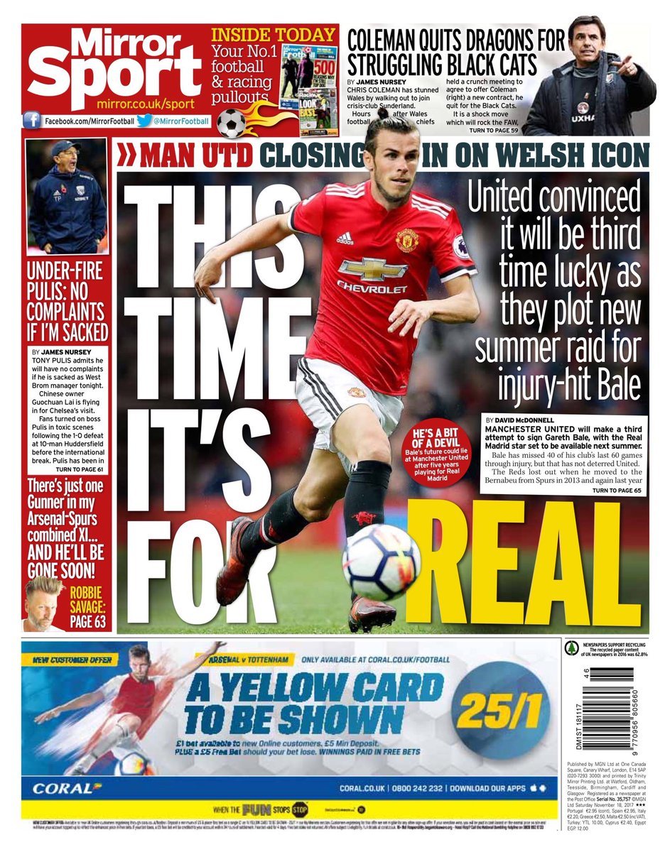Daily Mirror en su sección deportiva ha vestido directamente a Gareth Bale con la camiseta del Manchester y habla de una oferta que supere los 99 millones para que el Real Madrid no pierda dinero en la operación.