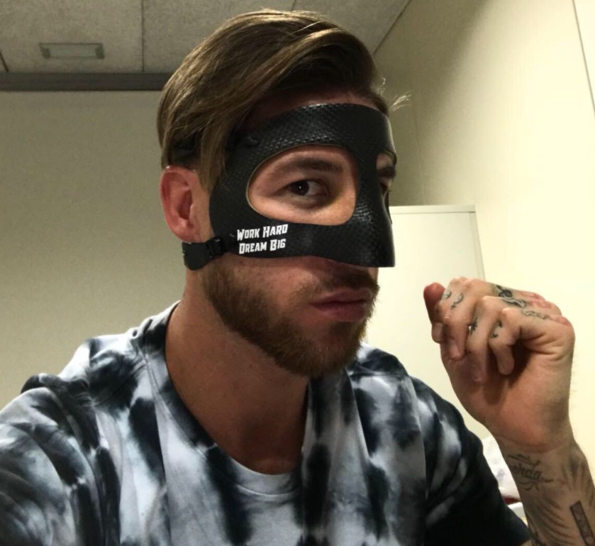 Una semana después, Ramos luce con orgullo en sus redes sociales la nueva máscara con la que jugará en los próximos partidos. Es la habitual en este tipo de lesiones, pero el central del Real Madrid ha decidido darle su toque personal.
